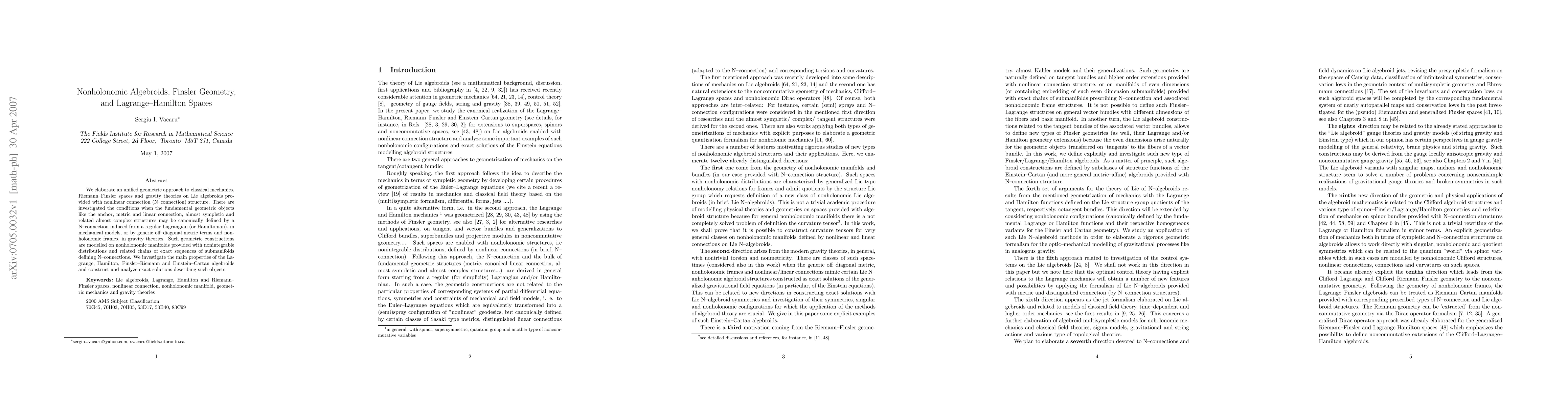 This paper develops a unified geometric framework for classical mechanics, Riemann-Finsler spaces, and gravity theories using nonholonomic algebroids with N-connections. It explores how fundamental geometric objects can be defined through Lagrangians, Hamiltonians, and off-diagonal metric terms, and examines properties and exact solutions of Lagrange, Hamilton, Finsler-Riemann, and Einstein-Cartan algebroids.