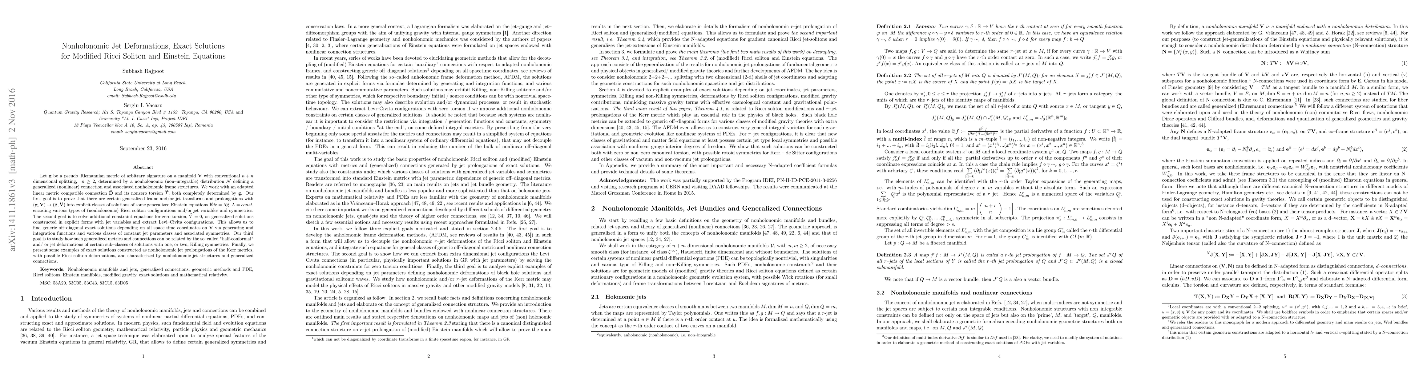 Let $\mathbf{g}$ be a pseudo--Riemanian metric of arbitrary signature on a manifold $\mathbf{V}$ with conventional $n+n$ dimensional splitting, $\ n\geq 2,$ determined by a nonholonomic (non--integrable) distribution $\mathcal{N}$ defining a generalized (nonlinear) connection and associated nonholonomic frame structures. We shall work with a correspondingly adapted linear metric compatible connection $\hat{\mathbf{D}}$ and its nonzero torsion $\hat{\mathcal{T}}$, both completely determined by $\mathbf{g}$. Our first goal is to prove that there are certain generalized frame and/or jet transforms and prolongations with $(\mathbf{g},\mathbf{V})\rightarrow (\hat{\mathbf{g}},\hat{\mathbf{V}})$ into explicit classes of solutions of some generalized Einstein equations $\hat{\mathbf{R}}\mathit{ic}=\Lambda \hat{\mathbf{g}}$, $\Lambda =const$, encoding various types of nonholonomic) Ricci soliton configurations and/or jet variables and symmetries. The second goal is to solve additional constraint equations for zero torsion, $\hat{\mathcal{T}}=0$, on generalized solutions constructed in explicit forms with jet variables and extract Levi-Civita configurations. This allows us to find generic off-diagonal exact solutions depending on all space time coordinates on $\mathbf{V}$ via generating and integration functions and various classes of constant jet parameters and associated symmetries. We shall study (third goal) how such generalized metrics and connections can be related by so-called "half-conformal" and/ or jet deformations of certain sub-classes of solutions with one, or two, Killing symmetries. Finally, there are considered some examples when exact solutions are constructed as nonholonomic jet prolongations of the Kerr metrics, with possible Ricci soliton deformations, and characterized by nonholonomic jet structures and generalized connections.
