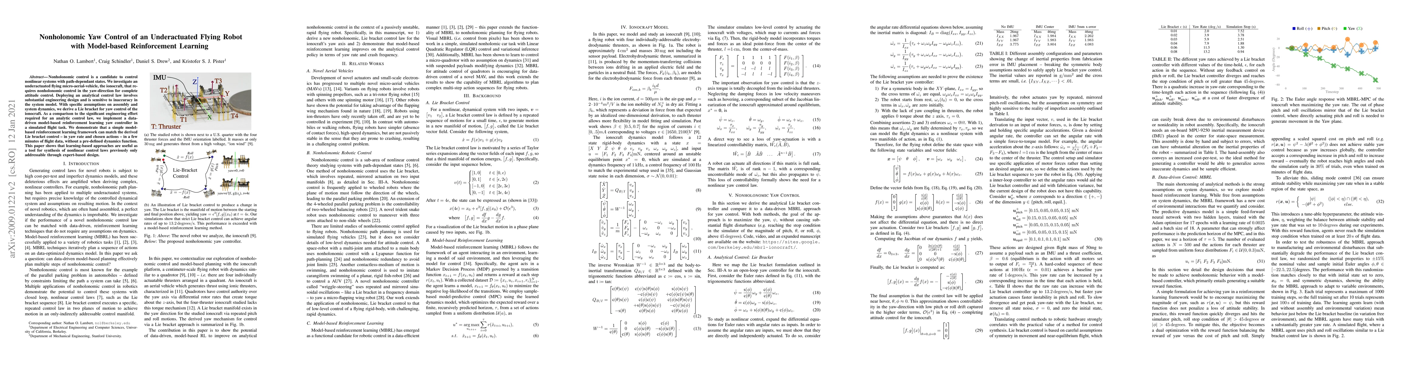This paper explores nonholonomic yaw control for an underactuated flying robot, the ionocraft, using both analytical and reinforcement learning methods. It demonstrates that a model-based reinforcement learning approach can effectively match the performance of an analytically derived control law with minimal flight data.
