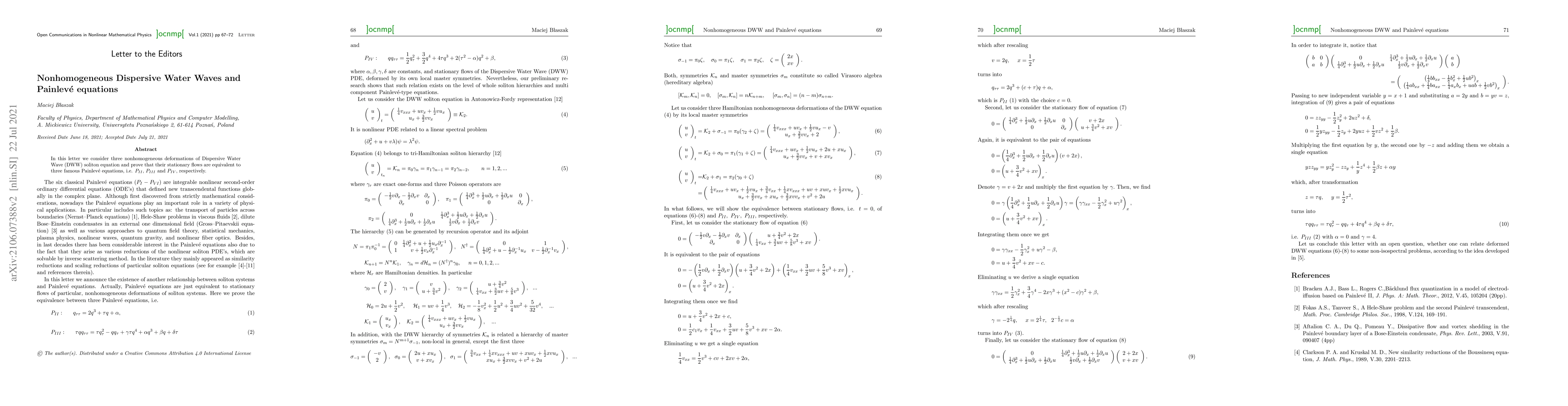 This paper explores three variations of the Dispersive Water Wave soliton equation, demonstrating that their stationary flows correspond to the renowned Painlevé equations $P_{II}$, $P_{III}$, and $P_{IV}$. This establishes a deep connection between fluid dynamics and integrable systems.