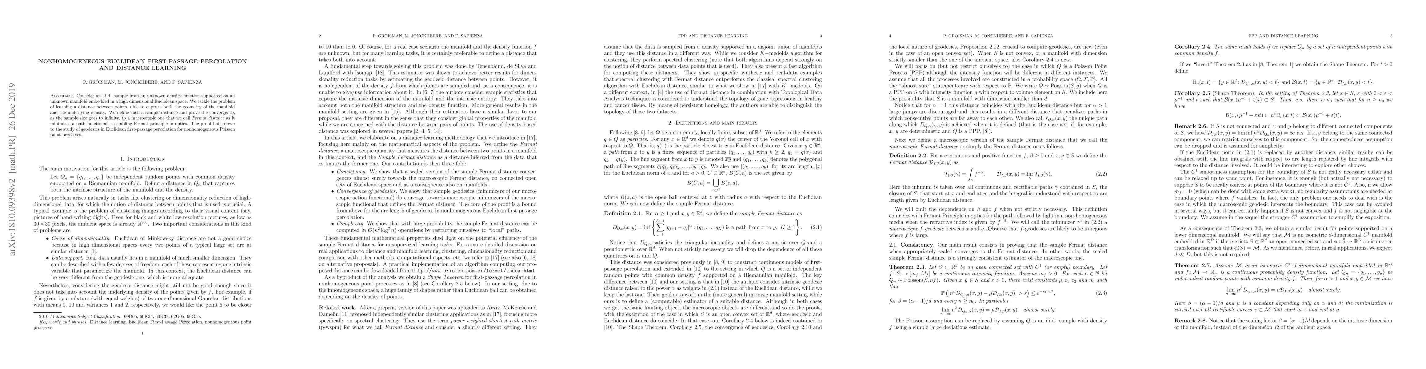 This paper explores learning a distance metric for points on an unknown manifold within high-dimensional space, proving that the microscopic distance converges to a macroscopic Fermat distance as sample size increases. The proof involves studying geodesics in Euclidean first-passage percolation for nonhomogeneous Poisson point processes.