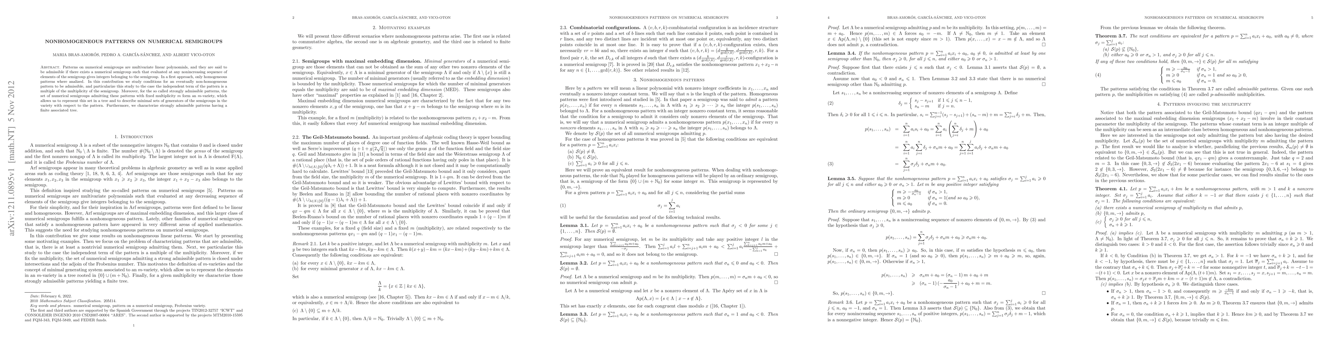 Patterns on numerical semigroups are multivariate linear polynomials, and they are said to be admissible if there exists a numerical semigroup such that evaluated at any nonincreasing sequence of elements of the semigroup gives integers belonging to the semigroup. In a first approach, only homogeneous patterns where analized. In this contribution we study conditions for an eventually non-homogeneous pattern to be admissible, and particularize this study to the case the independent term of the pattern is a multiple of the multiplicity of the semigroup. Moreover, for the so called strongly admissible patterns, the set of numerical semigroups admitting these patterns with fixed multiplicity $m$ form an $m$-variety, which allows us to represent this set in a tree and to describe minimal sets of generators of the semigroups in the variety with respect to the pattern. Furthermore, we characterize strongly admissible patterns having a finite associated tree.