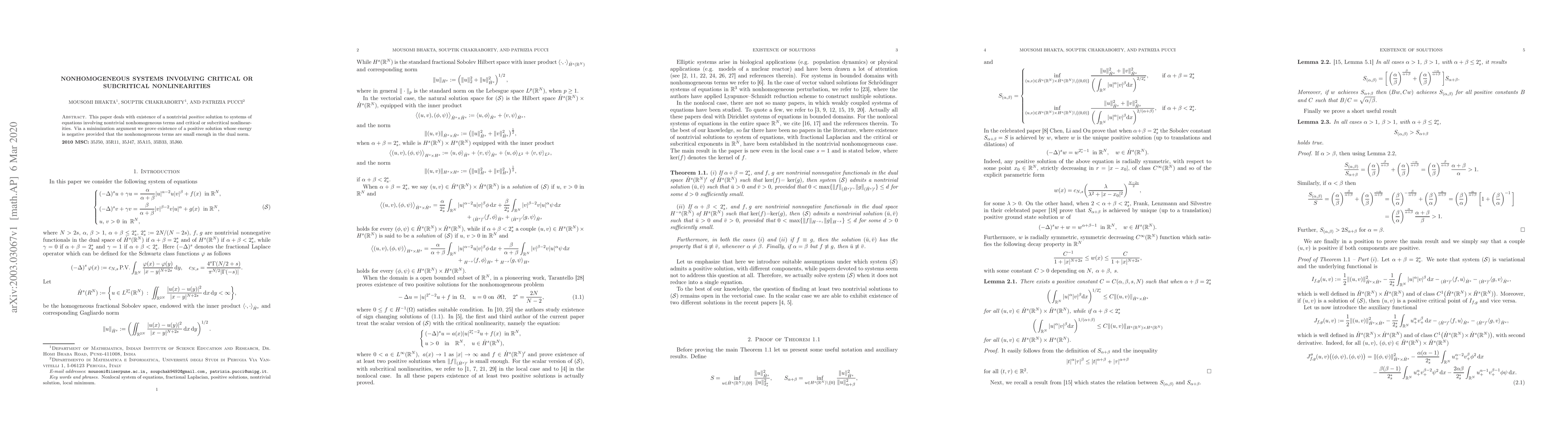 This paper proves the existence of a nontrivial positive solution to nonhomogeneous systems with critical or subcritical nonlinearities using a minimization argument, provided the nonhomogeneous terms are sufficiently small in the dual norm. The solution's energy is shown to be negative under these conditions.