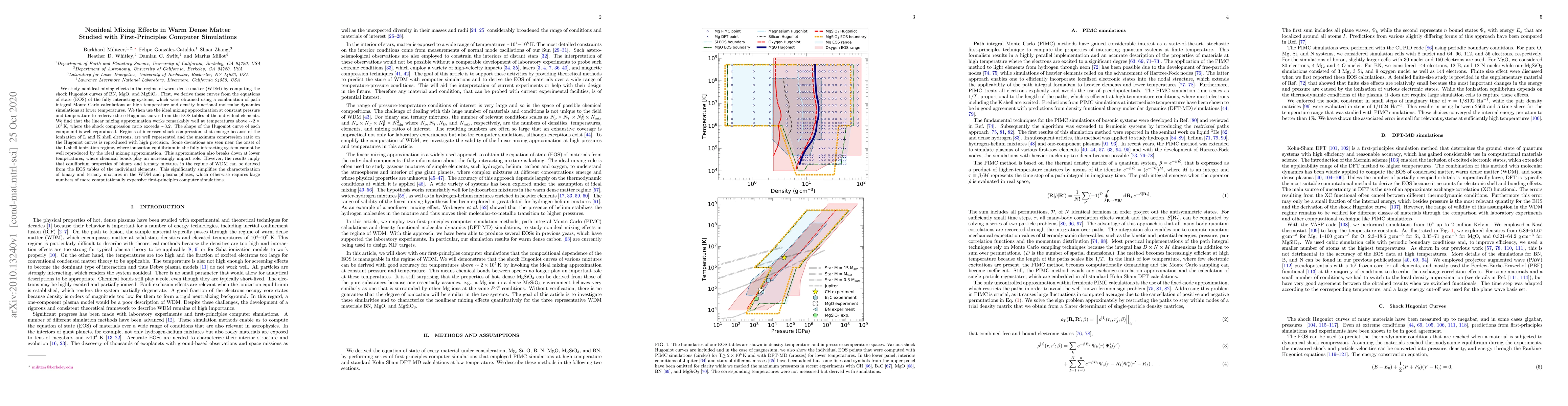 This study investigates nonideal mixing effects in warm dense matter (WDM) through shock Hugoniot curves for BN, MgO, and MgSiO_3, derived using first-principles simulations. The linear mixing approximation effectively reproduces Hugoniot curves at high temperatures, simplifying the characterization of WDM mixtures.