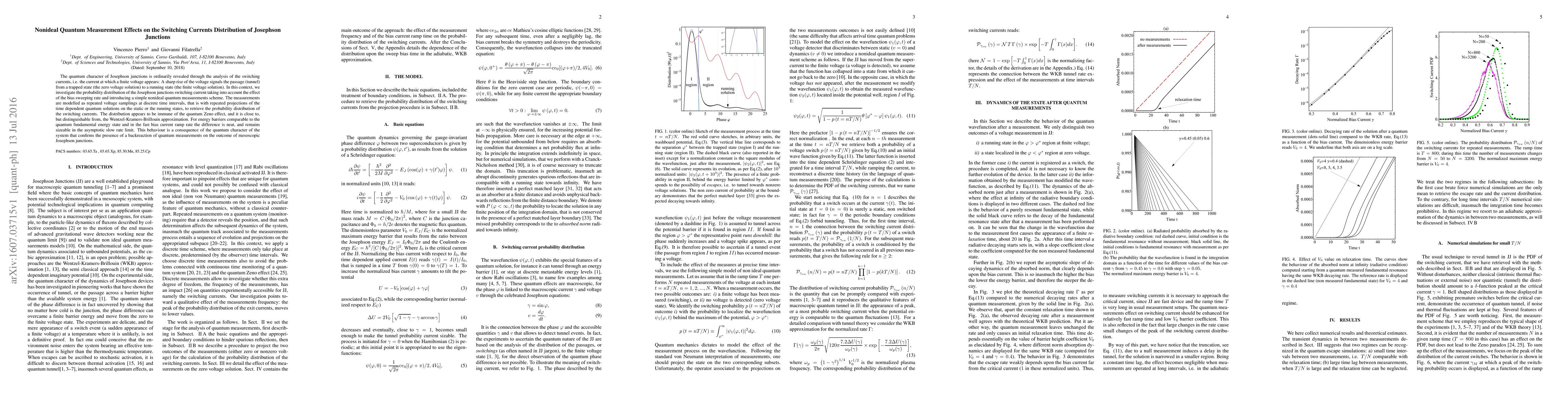 The quantum character of Josephson junctions is ordinarily revealed through the analysis of the switching currents, i.e. the current at which a finite voltage appears: A sharp rise of the voltage signals the passage (tunnel) from a trapped state (the zero voltage solution) to a running state (the finite voltage solution). In this context, we investigate the probability distribution of the Josephson junctions switching current taking into account the effect of the bias sweeping rate and introducing a simple nonideal quantum measurements scheme. The measurements are modelled as repeated voltage samplings at discrete time intervals, that is with repeated projections of the time dependent quantum solutions on the static or the running states, to retrieve the probability distribution of the switching currents. The distribution appears to be immune of the quantum Zeno effect, and it is close to, but distinguishable from, the Wentzel-Kramers-Brillouin approximation. For energy barriers comparable to the quantum fundamental energy state and in the fast bias current ramp rate the difference is neat, and remains sizeable in the asymptotic slow rate limit. This behaviour is a consequence of the quantum character of the system that confirms the presence of a backreaction of quantum measurements on the outcome of mesoscopic Josephson junctions.