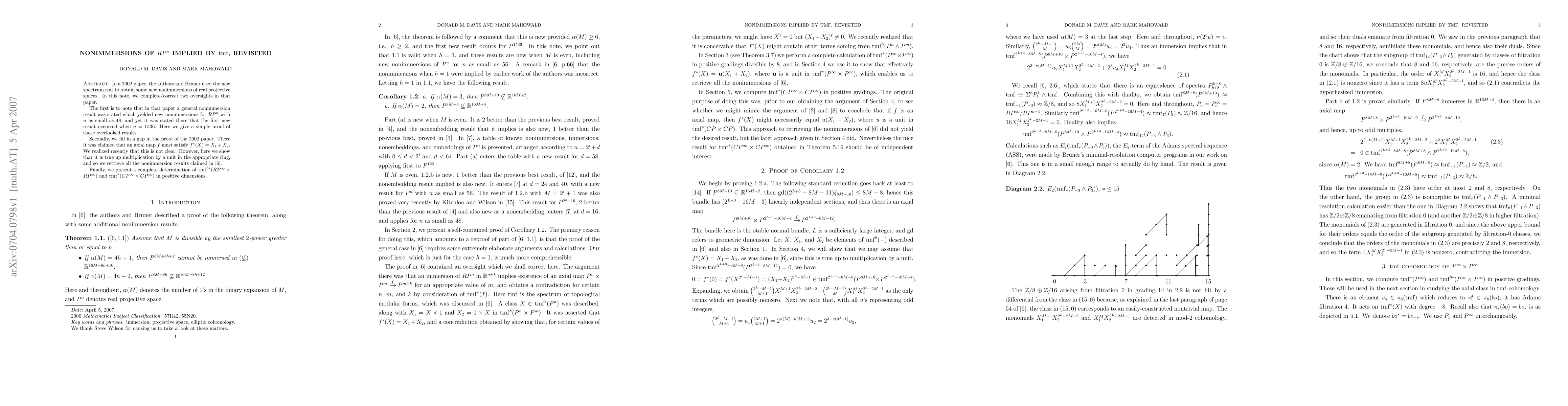 In a 2002 paper, the authors and Bruner used the new spectrum tmf to obtain some new nonimmersions of real projective spaces. In this note, we complete/correct two oversights in that paper. The first is to note that in that paper a general nonimmersion result was stated which yielded new nonimmersions for RP^n with n as small as 48, and yet it was stated there that the first new result occurred when n=1536. Here we give a simple proof of those overlooked results. Secondly, we fill in a gap in the proof of the 2002 paper. There it was claimed that an axial map f must satisfy f^*(X)=X_1+X_2. We realized recently that this is not clear. However, here we show that it is true up multiplication by a unit in the appropriate ring, and so we retrieve all the nonimmersion results claimed in the original paper. Finally, we present a complete determination of tmf^{8*}(RP^\infty\times RP^\infty) and tmf^*(CP^\infty\times CP^\infty) in positive dimensions.