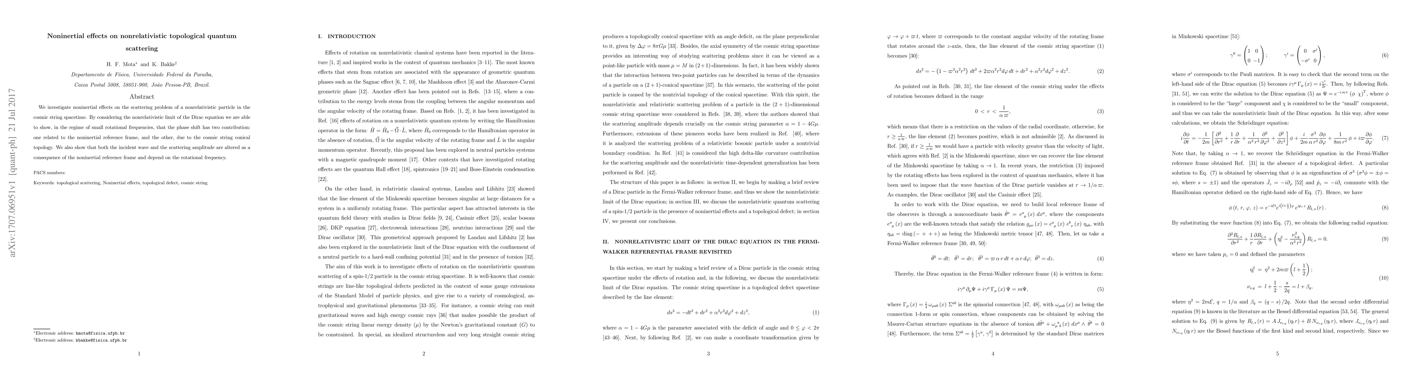 We investigate noninertial effects on the scattering problem of a nonrelativistic particle in the cosmic string spacetime. By considering the nonrelativistic limit of the Dirac equation we are able to show, in the regime of small rotational frequencies, that the phase shift has two contribution: one related to the noninertial reference frame, and the other, due to the cosmic string conical topology. We also show that both the incident wave and the scattering amplitude are altered as a consequence of the noninertial reference frame and depend on the rotational frequency.