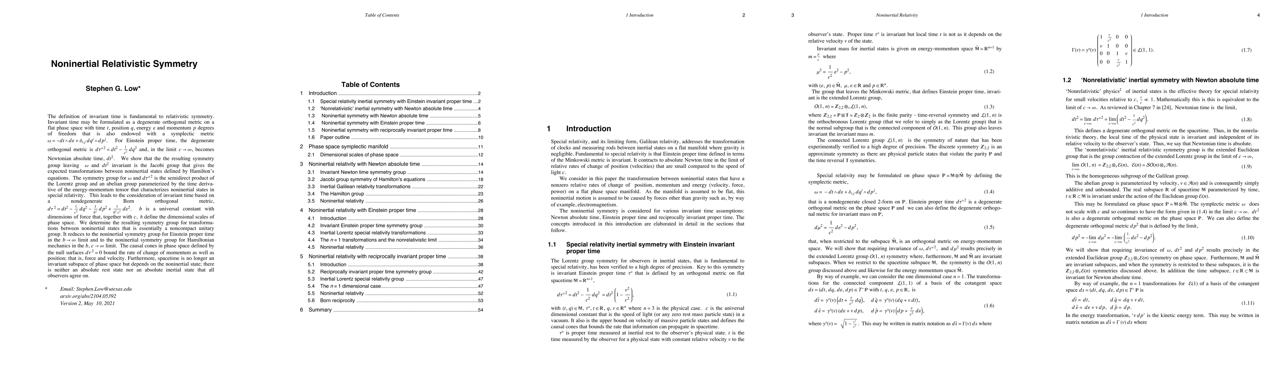 The definition of invariant time is fundamental to relativistic symmetry. Invariant time may be formulated as a degenerate orthogonal metric on a flat phase space with time, position, energy and momentum degrees of freedom that is also endowed with a symplectic metric $\omega =-d t\wedge d \varepsilon +\delta _{i,j}d q^i\wedge d p^j$. For Einstein proper time, the degenerate orthogonal metric is $d \tau^{o 2}=d t^2-\frac{1}{c^2}d q^2$ and, in the limit $c\to \infty$, becomes Newtonian absolute time, $d t^2$. We show that the the resulting symmetry group leaving $\omega$ and $d t^2$ invariant is the Jacobi group that gives the expected transformations between noninertial states defined by Hamilton's equations. The symmetry group for $\omega$ and $d \tau^{o 2}$ is the semidirect product of the Lorentz and an abelian group parameterized by the time derivative of the energy-momentum tensor that characterizes noninertial states in special relativity. This leads to the consideration of invariant time based on a nondegenerate Born metric, $d \tau^2=d t^2-\frac{1}{c^2}d q^2-\frac{1}{b^2}d p^2+\frac{1}{b^2c^2}d \varepsilon^2$. $b$ is a universal constant with dimensions of force that, with $c,\hbar$ define the dimensional scales of phase space. We determine that the symmetry group for transformations between noninertial states is essentially a noncompact unitary group. It reduces to the noninertial symmetry group for Einstein proper time in the $b\to \infty$ limit and to the noninertial symmetry group for Hamiltonian mechanics in the $b,c\to \infty$ limit. The causal cones in phase space defined by the null surfaces $d\tau^2=0$ bound the rate of change of momentum as well as position. Furthermore, spacetime is no longer an invariant subspace of phase space but depends on the noninertial state; there is neither an absolute rest state nor an absolute inertial state that all observers agree on.