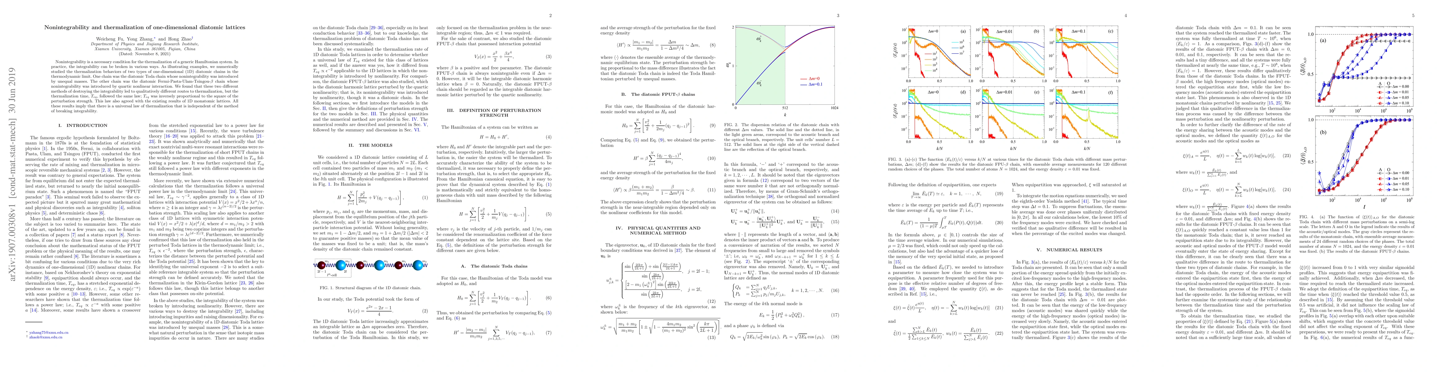 This paper investigates the thermalization behaviors of two types of one-dimensional diatomic lattices, demonstrating that nonintegrability leads to thermalization regardless of the method used to break integrability. Both studied chains exhibited different thermalization routes, but shared a universal law where thermalization time inversely scales with the square of the perturbation strength.
