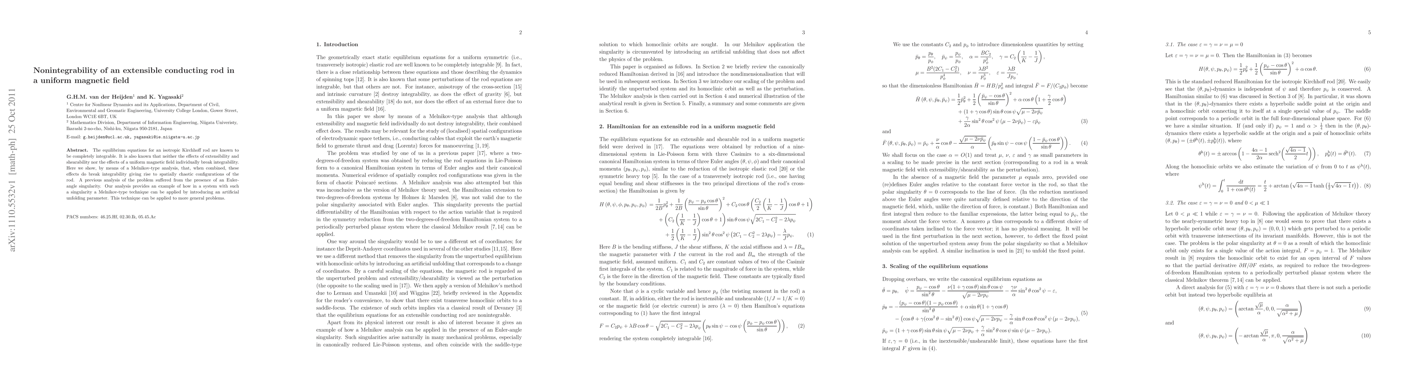 This paper demonstrates that the combined effects of extensibility and a uniform magnetic field on an isotropic Kirchhoff rod break its integrability, leading to spatially chaotic configurations, using a Melnikov-type analysis. The study resolves previous singularities in Euler-angle analysis by introducing an artificial unfolding parameter, showcasing a broadly applicable technique for similar systems.