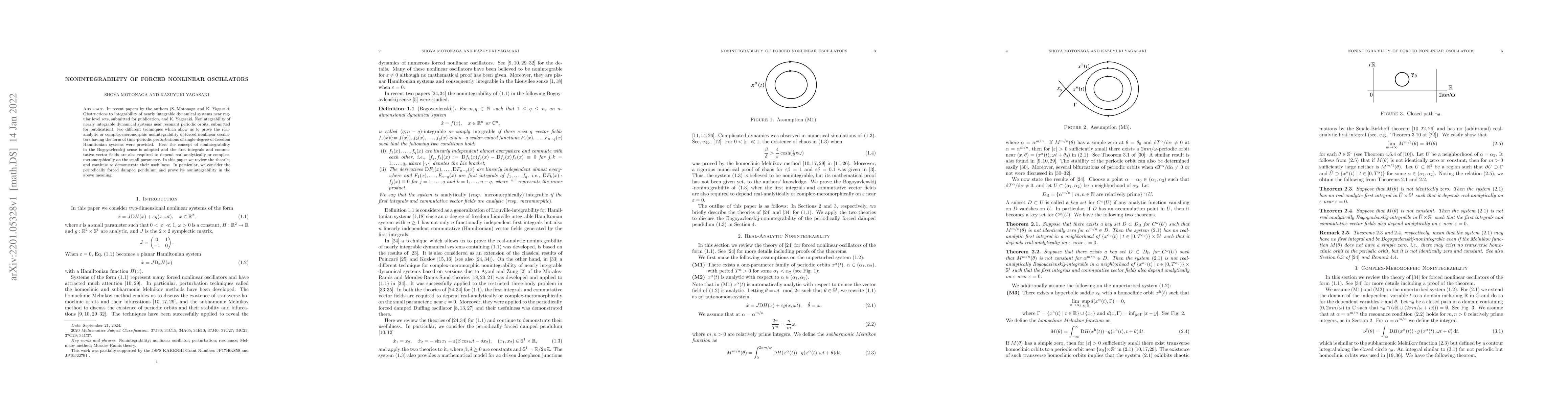This paper reviews techniques to prove the nonintegrability of forced nonlinear oscillators, such as time-periodically perturbed single-degree-of-freedom Hamiltonian systems. It demonstrates the application of these methods to show the nonintegrability of the periodically forced damped pendulum.