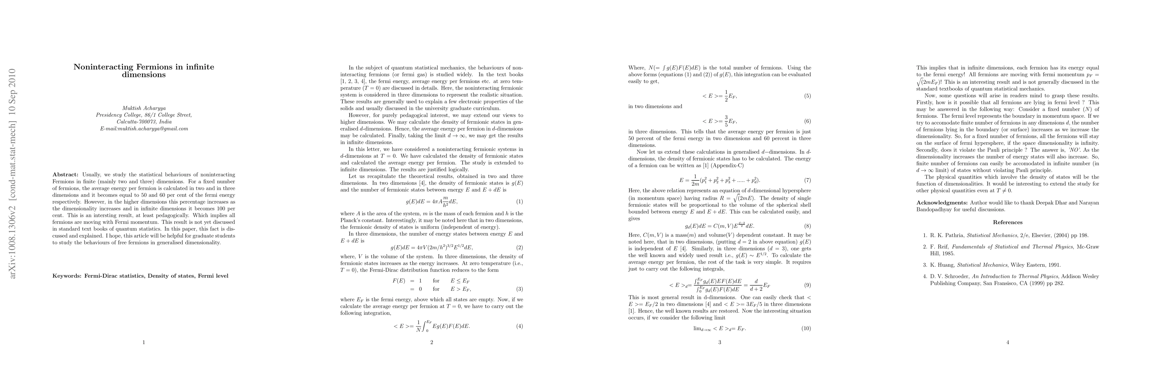 Usually, we study the statistical behaviours of noninteracting Fermions in finite (mainly two and three) dimensions. For a fixed number of fermions, the average energy per fermion is calculated in two and in three dimensions and it becomes equal to 50 and 60 per cent of the fermi energy respectively. However, in the higher dimensions this percentage increases as the dimensionality increases and in infinite dimensions it becomes 100 per cent. This is an intersting result, at least pedagogically. Which implies all fermions are moving with Fermi momentum. This result is not yet discussed in standard text books of quantum statistics. In this paper, this fact is discussed and explained. I hope, this article will be helpful for graduate students to study the behaviours of free fermions in generalised dimensionality.