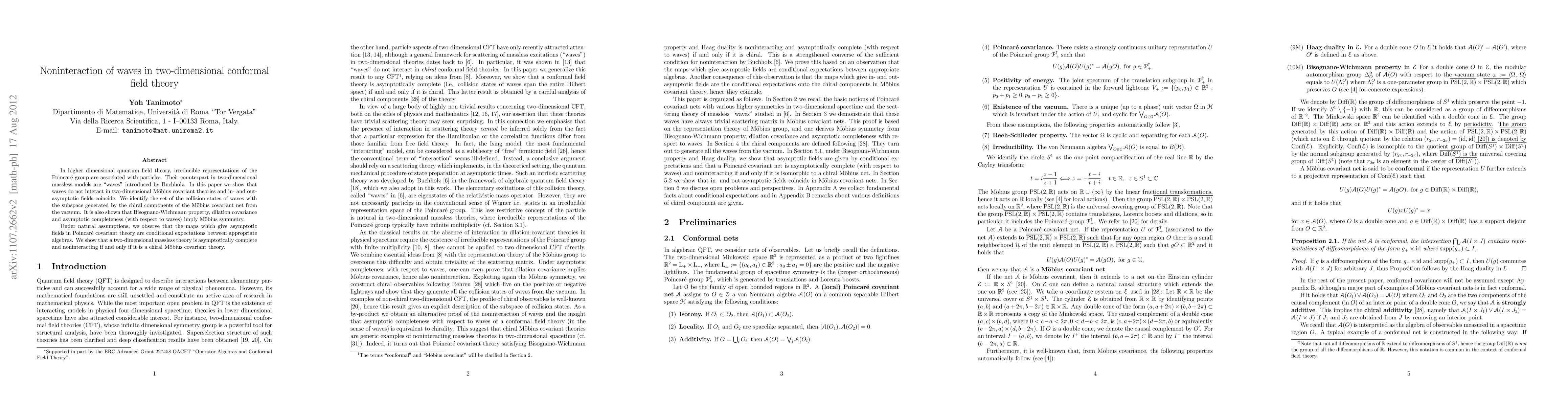 This paper demonstrates that waves in two-dimensional conformal field theories do not interact, with in- and out-asymptotic fields coinciding. It establishes that a two-dimensional massless theory is asymptotically complete and noninteracting if and only if it is a chiral Moebius covariant theory.