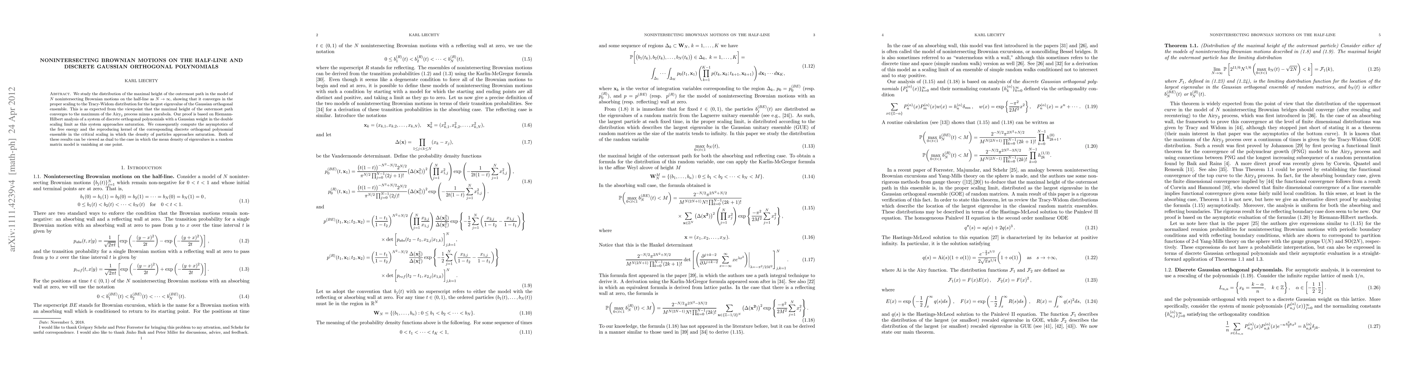 We study the distribution of the maximal height of the outermost path in the model of $N$ nonintersecting Brownian motions on the half-line as $N\to \infty$, showing that it converges in the proper scaling to the Tracy-Widom distribution for the largest eigenvalue of the Gaussian orthogonal ensemble. This is as expected from the viewpoint that the maximal height of the outermost path converges to the maximum of the $\textrm{Airy}_2$ process minus a parabola. Our proof is based on Riemann-Hilbert analysis of a system of discrete orthogonal polynomials with a Gaussian weight in the double scaling limit as this system approaches saturation. We consequently compute the asymptotics of the free energy and the reproducing kernel of the corresponding discrete orthogonal polynomial ensemble in the critical scaling in which the density of particles approaches saturation. Both of these results can be viewed as dual to the case in which the mean density of eigenvalues in a random matrix model is vanishing at one point.