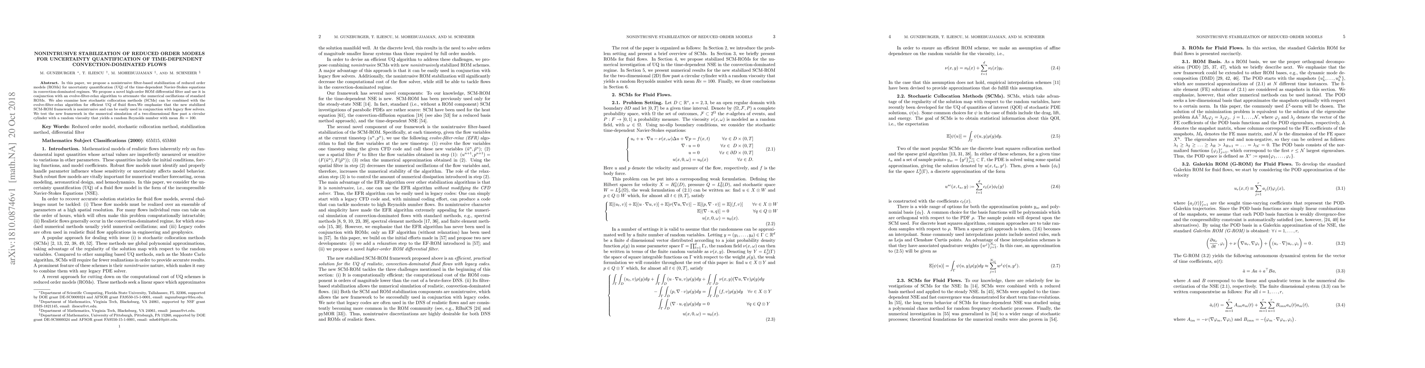 This paper introduces a nonintrusive stabilization method for reduced order models (ROMs) to quantify uncertainties in time-dependent convection-dominated fluid flows. The proposed high-order ROM differential filter, used with an evolve-filter-relax algorithm, effectively reduces numerical oscillations, and the new framework is tested on a two-dimensional flow past a cylinder with random viscosity.