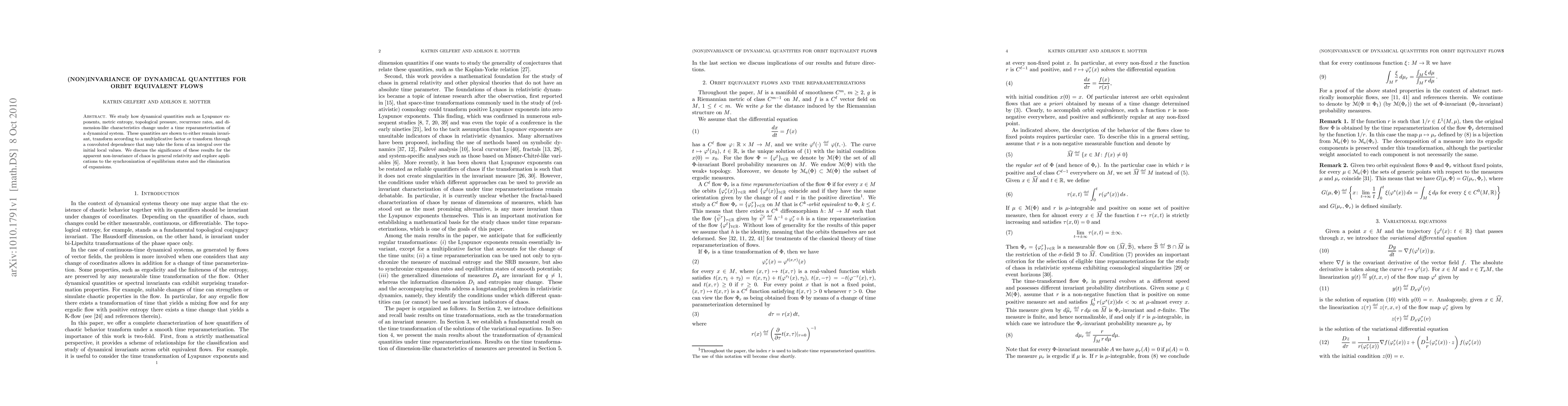 We study how dynamical quantities such as Lyapunov exponents, metric entropy, topological pressure, recurrence rates, and dimension-like characteristics change under a time reparameterization of a dynamical system. These quantities are shown to either remain invariant, transform according to a multiplicative factor or transform through a convoluted dependence that may take the form of an integral over the initial local values. We discuss the significance of these results for the apparent non-invariance of chaos in general relativity and explore applications to the synchronization of equilibrium states and the elimination of expansions.