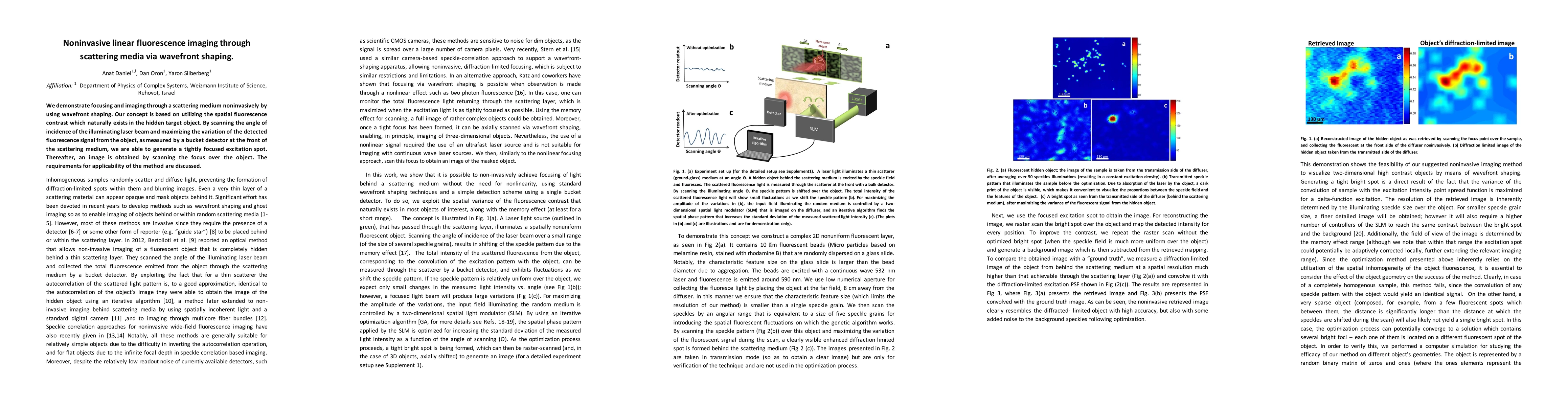 Researchers developed a noninvasive method for imaging objects hidden in scattering media using wavefront shaping and maximizing fluorescence contrast. This technique generates a tightly focused excitation spot, allowing for high-quality images to be obtained through the medium.
