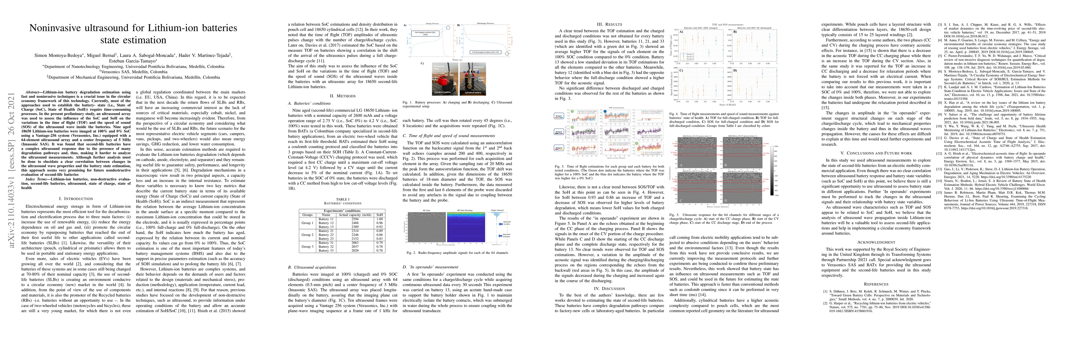 This study investigates the use of noninvasive ultrasound techniques to estimate the State of Charge (SoC) and State of Health (SoH) of Lithium-ion batteries, finding that ultrasound wave properties vary with battery state. While complex degradation pathways in second-life batteries complicate analysis, the method shows promise for future nondestructive evaluation.