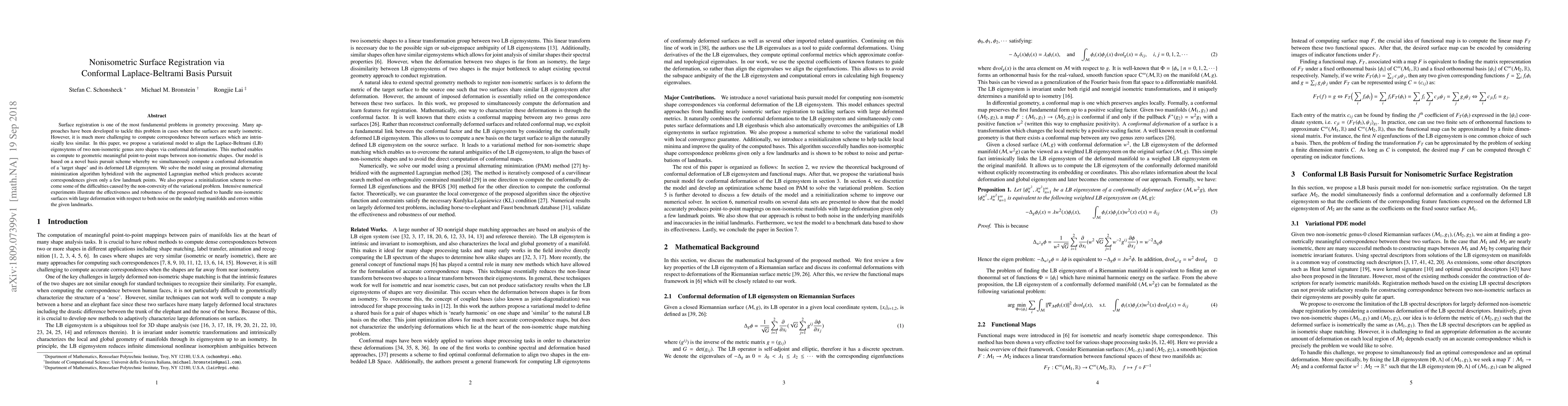 Researchers propose a method for aligning non-isometric surfaces using conformal Laplace-Beltrami basis pursuit, achieving accurate correspondences with robustness to noise and landmark errors.