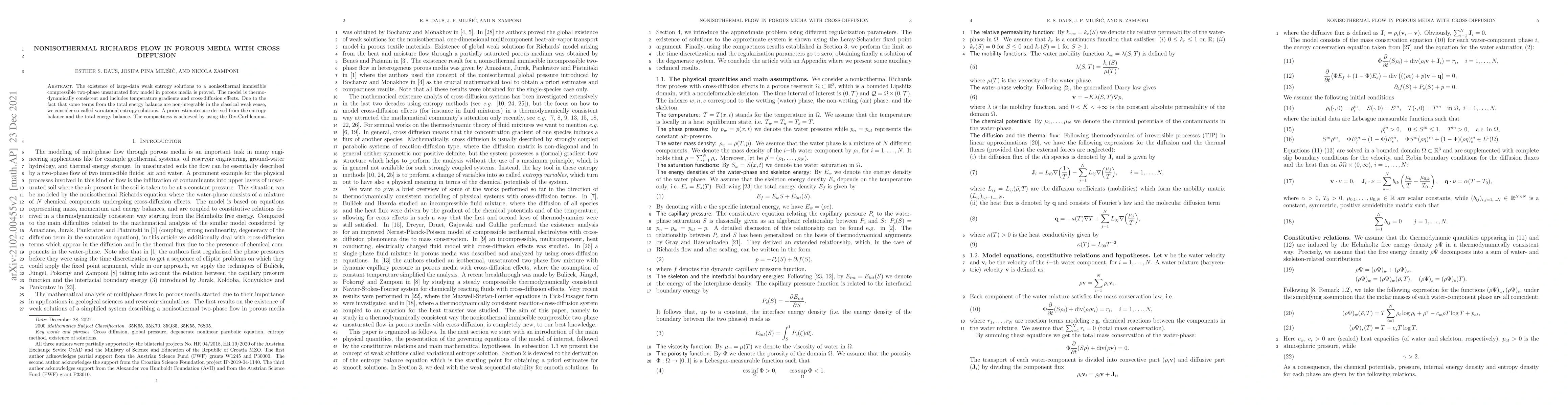 The research introduces a unique perspective on entropy solutions for a class of partial differential equations arising in porous media flow, addressing a gap in the literature on cross-diffusion effects in nonisothermal two-phase flow models.