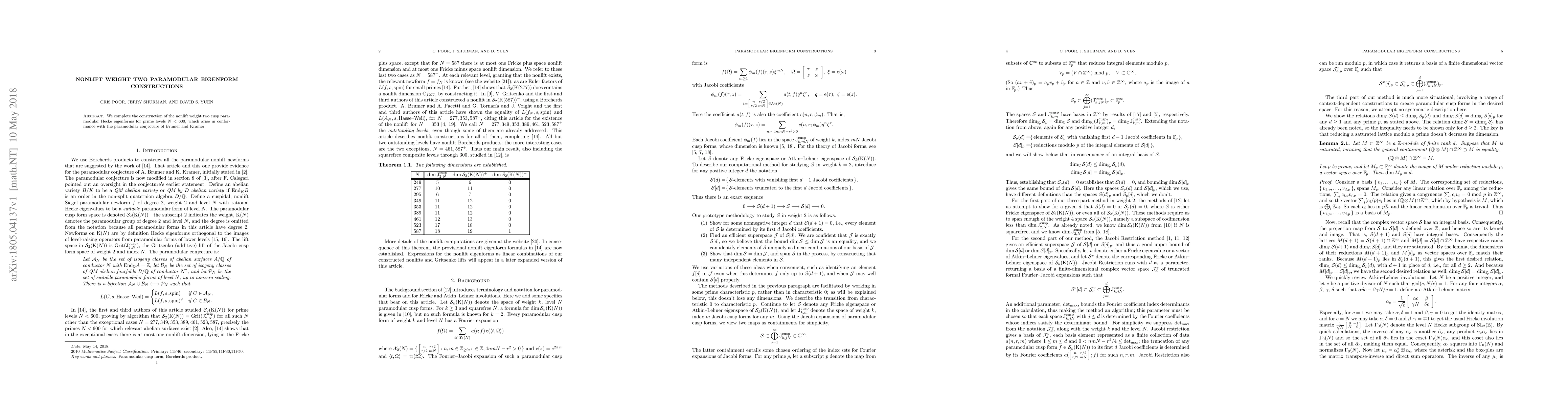 This paper completes the construction of nonlift weight two cusp paramodular Hecke eigenforms for prime levels below 600, aligning with the paramodular conjecture proposed by Brumer and Kramer. The results are significant for understanding modular forms and their applications.
