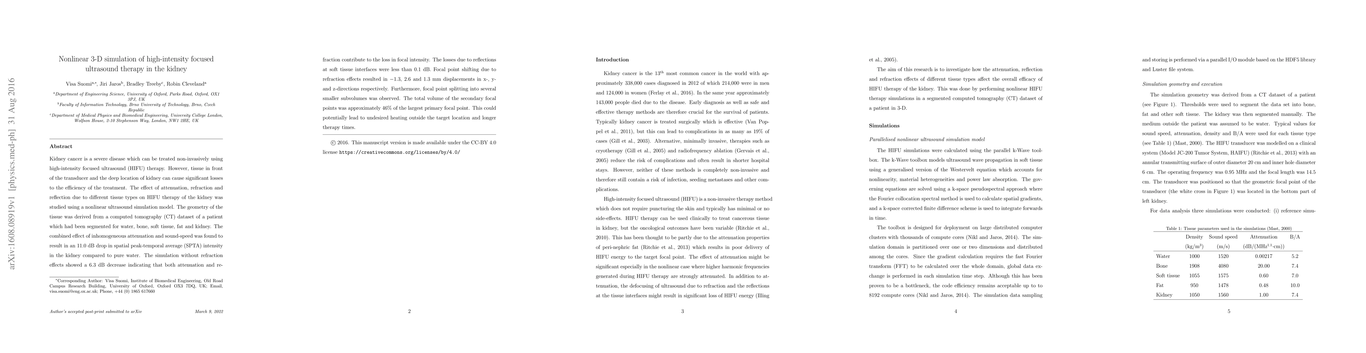 This study uses a nonlinear 3-D simulation to analyze the effects of attenuation, refraction, and reflection on high-intensity focused ultrasound (HIFU) therapy for kidney cancer. The simulation revealed an 11.0 dB intensity drop in the kidney due to tissue inhomogeneities, with refraction contributing significantly to focal point displacement and splitting, potentially causing undesired heating and longer treatment times.