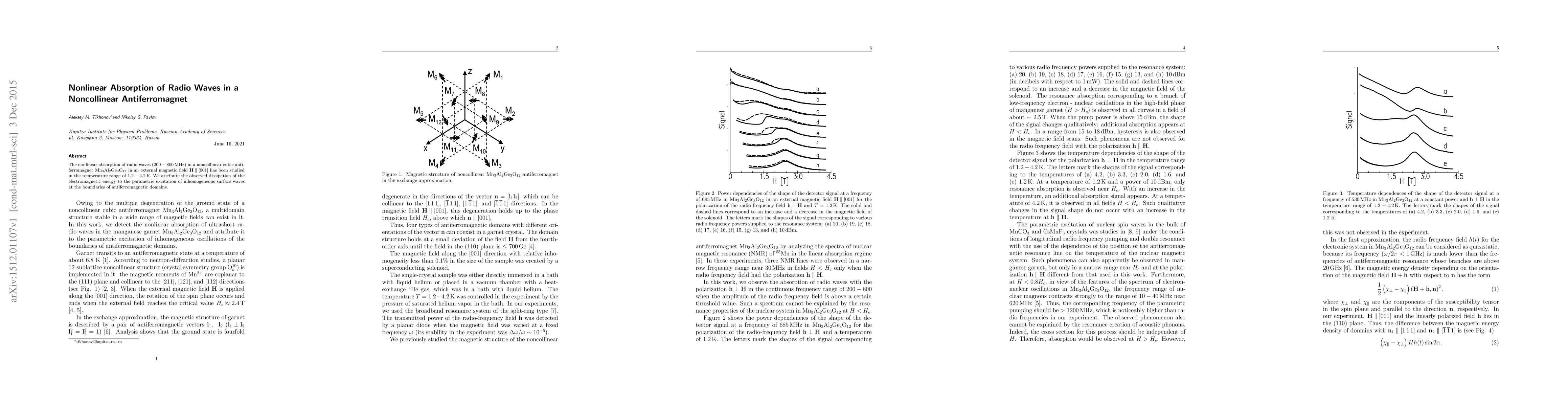 This study investigates the nonlinear absorption of radio waves in the cubic antiferromagnet Mn3Al2Ge3O12, attributing the observed electromagnetic energy dissipation to the parametric excitation of inhomogeneous surface waves at the antiferromagnetic domain boundaries. The research was conducted in a temperature range of 1.2 - 4.2 K with an external magnetic field aligned along the [001] direction.