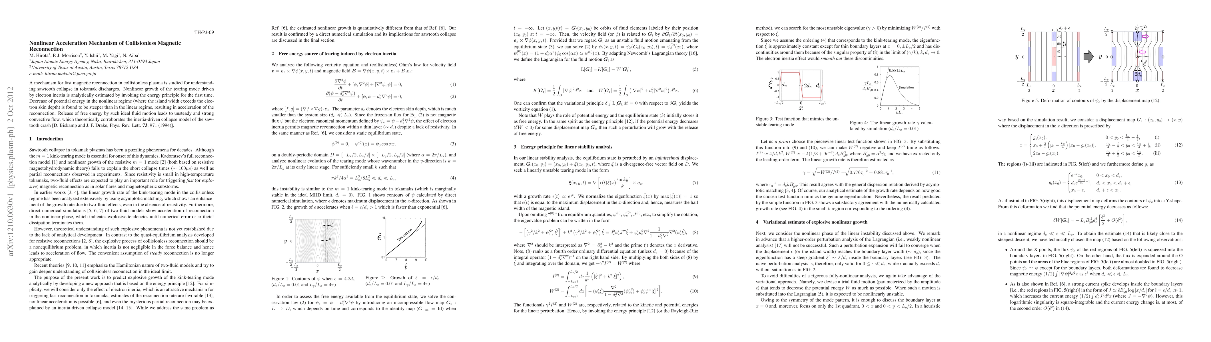 This paper investigates a nonlinear acceleration mechanism for collisionless magnetic reconnection, focusing on the tearing mode driven by electron inertia. The study finds that the reconnection rate accelerates due to a steeper decrease in potential energy in the nonlinear regime, supporting the inertia-driven collapse model for sawtooth crashes in tokamak discharges.