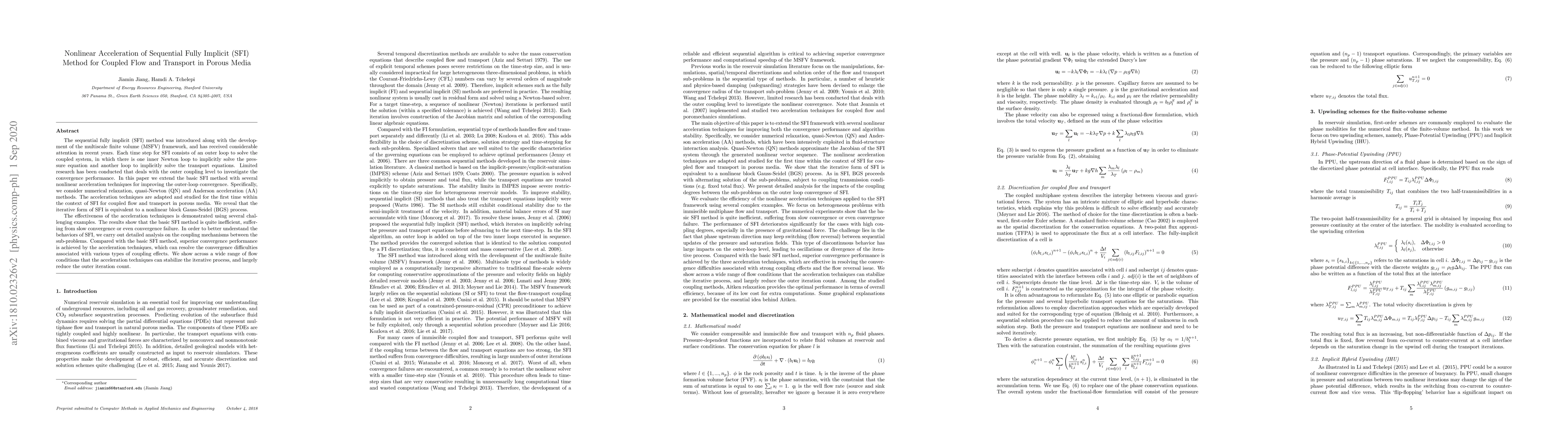 This paper introduces nonlinear acceleration techniques to enhance the convergence of the sequential fully implicit (SFI) method for solving coupled flow and transport in porous media. The study employs numerical relaxation, quasi-Newton, and Anderson acceleration methods, demonstrating significant improvements over the basic SFI method, which often suffers from slow convergence or failure.