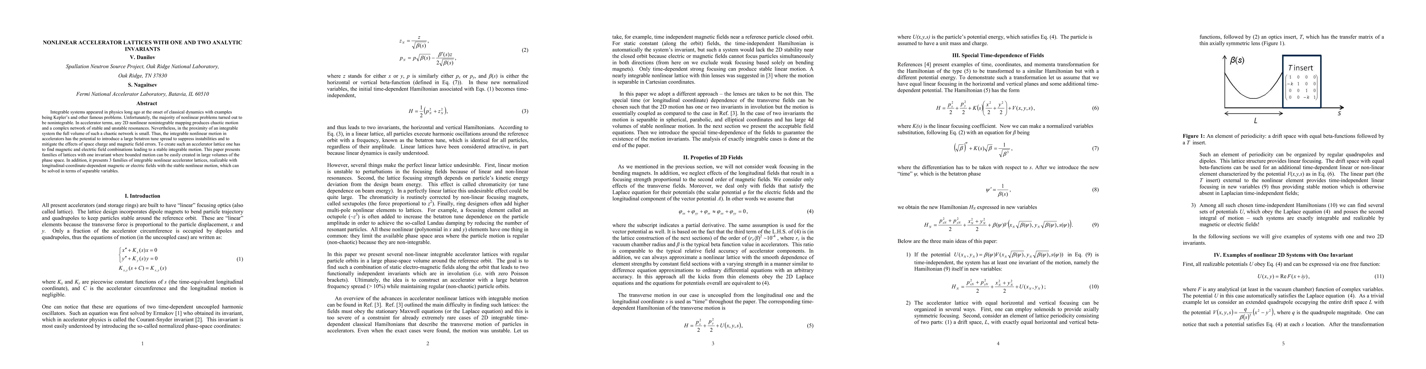 Integrable systems appeared in physics long ago at the onset of classical dynamics with examples being Kepler's and other famous problems. Unfortunately, the majority of nonlinear problems turned out to be nonintegrable. In accelerator terms, any 2D nonlinear nonintegrable mapping produces chaotic motion and a complex network of stable and unstable resonances. Nevertheless, in the proximity of an integrable system the full volume of such a chaotic network is small. Thus, the integrable nonlinear motion in accelerators has the potential to introduce a large betatron tune spread to suppress instabilities and to mitigate the effects of space charge and magnetic field errors. To create such an accelerator lattice one has to find magnetic and electrtic field combinations leading to a stable integrable motion. This paper presents families of lattices with one invariant where bounded motion can be easily created in large volumes of the phase space. In addition, it presents 3 families of integrable nonlinear accelerator lattices, realizable with longitudinal-coordinate-dependent magnetic or electric fields with the stable nonlinear motion, which can be solved in terms of separable variables.