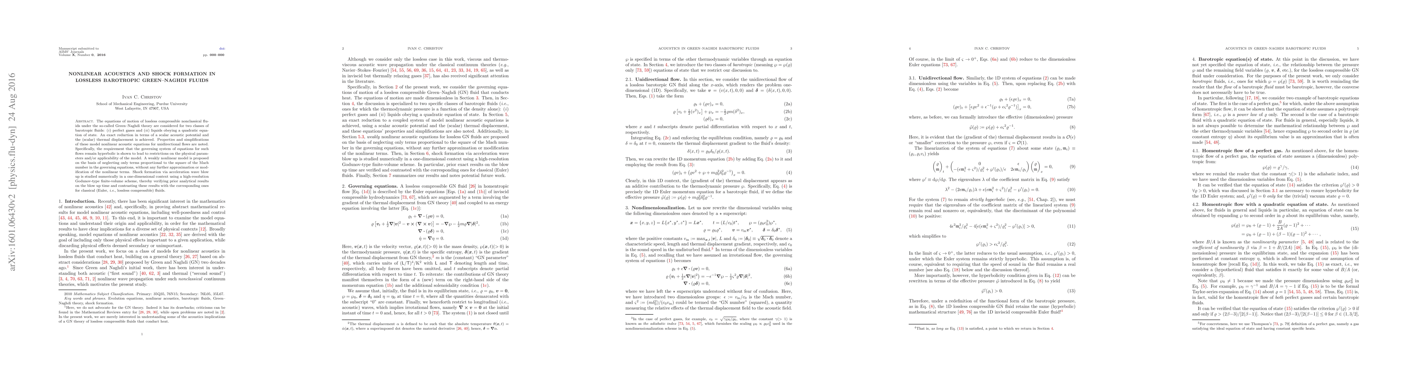 The equations of motion of lossless compressible nonclassical fluids under the so-called Green--Naghdi theory are considered for two classes of barotropic fluids: (\textit{i}) perfect gases and (\textit{ii}) liquids obeying a quadratic equation of state. An exact reduction in terms of a scalar acoustic potential and the (scalar) thermal displacement is achieved. Properties and simplifications of these model nonlinear acoustic equations for unidirectional flows are noted. Specifically, the requirement that the governing system of equations for such flows remain hyperbolic is shown to lead to restrictions on the physical parameters and/or applicability of the model. A weakly nonlinear model is proposed on the basis of neglecting only terms proportional to the square of the Mach number in the governing equations, without any further approximation or modification of the nonlinear terms. Shock formation via acceleration wave blowup is studied numerically in a one-dimensional context using a high-resolution Godunov-type finite-volume scheme, thereby verifying prior analytical results on the blowup time and contrasting these results with the corresponding ones for classical (Euler) fluids.