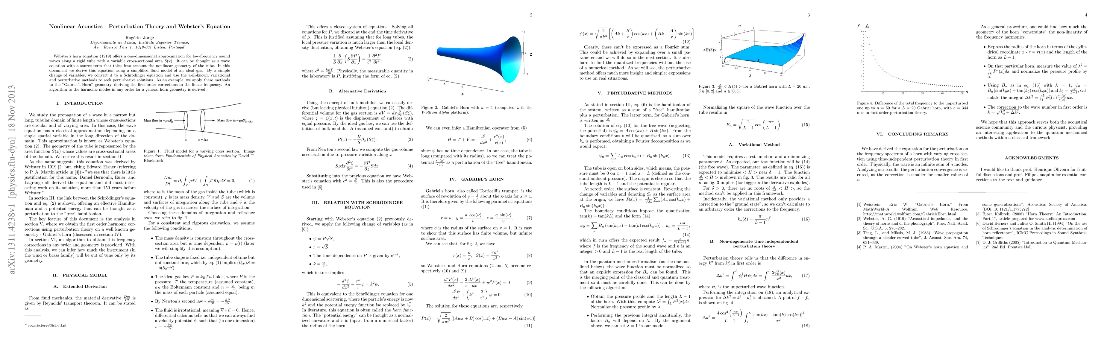 Webster's horn equation (1919) offers a one-dimensional approximation for low-frequency sound waves along a rigid tube with a variable cross-sectional area. It can be thought as a wave equation with a source term that takes into account the nonlinear geometry of the tube. In this document we derive this equation using a simplified fluid model of an ideal gas. By a simple change of variables, we convert it to a Schr\"odinger equation and use the well-known variational and perturbative methods to seek perturbative solutions. As an example, we apply these methods to the Gabriel's Horn geometry, deriving the first order corrections to the linear frequency. An algorithm to the harmonic modes in any order for a general horn geometry is derived.