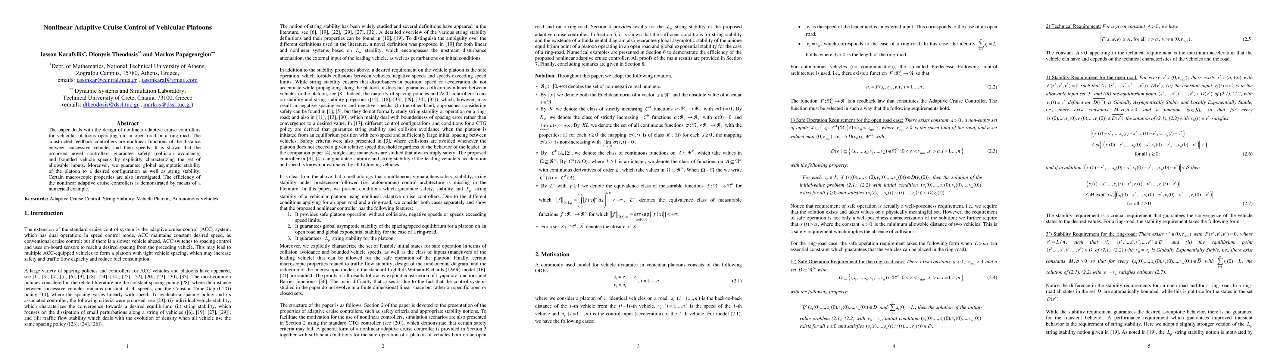 This paper designs nonlinear adaptive cruise controllers for vehicular platoons to ensure safety, stability, and desired speed configurations. The proposed controllers achieve global asymptotic stability and string stability, demonstrated through a numerical example.