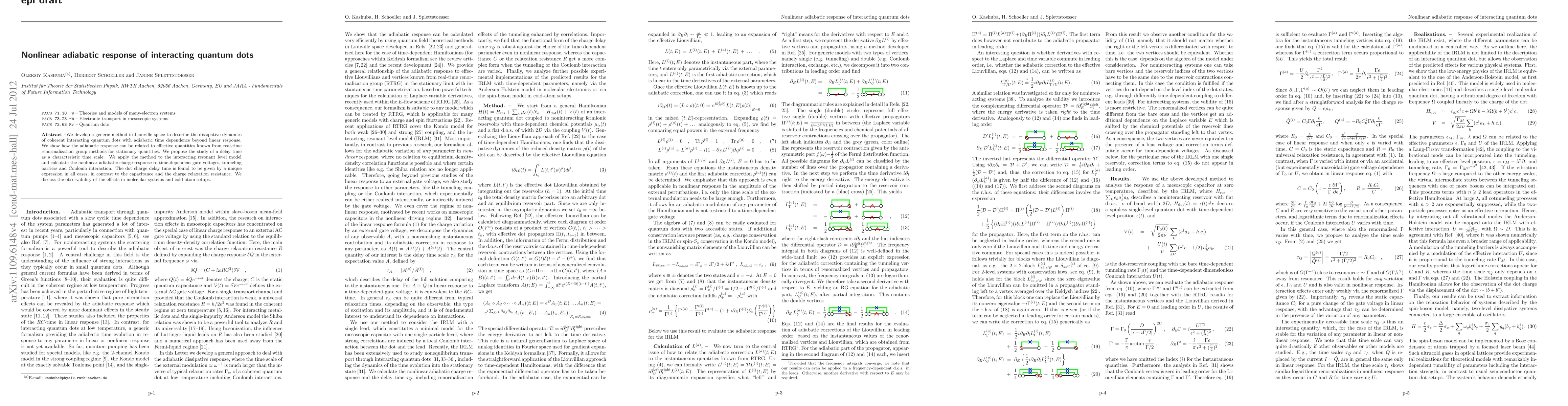 We develop a generic method in Liouville space to describe the dissipative dynamics of coherent interacting quantum dots with adiabatic time dependence beyond linear response. We show how the adiabatic response can be related to effective quantities known from real-time renormalization group methods for stationary quantities. We propose the study of a generalized $RC$-time as a characteristic time scale. We apply the method to the interacting resonant level model and calculate the nonlinear adiabatic charge response to time-dependent gate voltages, tunneling barriers and Coulomb interaction. The generalized $RC$-time is found to acquire a unique form in all cases, in contrast to the capacitance and the charge relaxation resistance. We discuss the observability of the effects in molecular systems and cold atom setups.