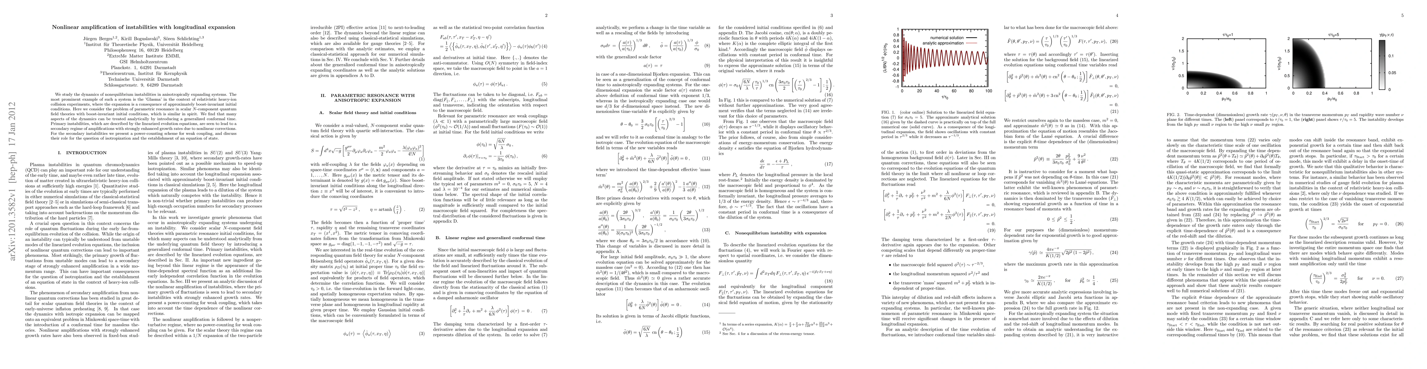 We study the dynamics of nonequilibrium instabilities in anisotropically expanding systems. The most prominent example of such a system is the 'Glasma' in the context of relativistic heavy-ion collision experiments, where the expansion is a consequence of approximately boost-invariant initial conditions. Here we consider the problem of parametric resonance in scalar $N$-component quantum field theories with boost-invariant initial conditions, which is similar in spirit. We find that many aspects of the dynamics can be treated analytically by introducing a generalized conformal time. Primary instabilities, which are described by the linearized evolution equations, are seen to lead to a secondary regime of amplifications with strongly enhanced growth rates due to nonlinear corrections. For the secondary instabilities we present a power-counting scheme for weak coupling, and discuss their role for the question of isotropization and the establishment of an equation of state.