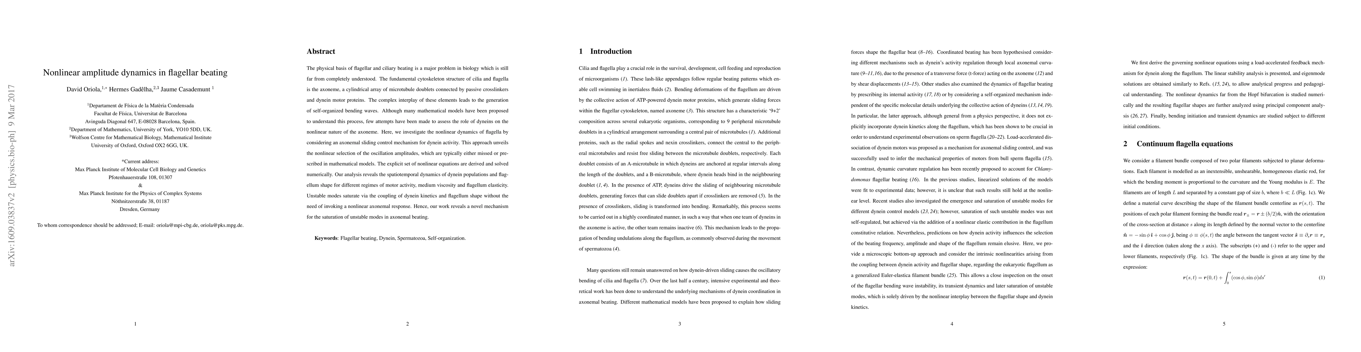 The physical basis of flagellar and ciliary beating is a major problem in biology which is still far from completely understood. The fundamental cytoskeleton structure of cilia and flagella is the axoneme, a cylindrical array of microtubule doublets connected by passive crosslinkers and dynein motor proteins. The complex interplay of these elements leads to the generation of self-organized bending waves. Although many mathematical models have been proposed to understand this process, few attempts have been made to assess the role of dyneins on the nonlinear nature of the axoneme. Here, we investigate the nonlinear dynamics of flagella by considering an axonemal sliding control mechanism for dynein activity. This approach unveils the nonlinear selection of the oscillation amplitudes, which are typically either missed or prescribed in mathematical models. The explicit set of nonlinear equations are derived and solved numerically. Our analysis reveals the spatiotemporal dynamics of dynein populations and flagellum shape for different regimes of motor activity, medium viscosity and flagellum elasticity. Unstable modes saturate via the coupling of dynein kinetics and flagellum shape without the need of invoking a nonlinear axonemal response. Hence, our work reveals a novel mechanism for the saturation of unstable modes in axonemal beating.
