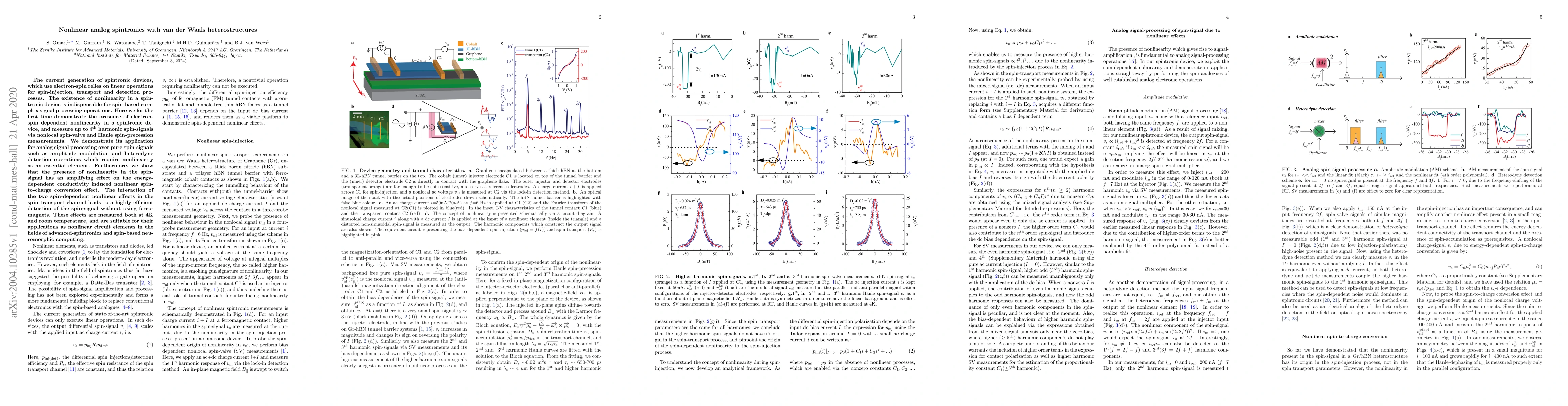 The current generation of spintronic devices, which use electron-spin relies on linear operations for spin-injection, transport and detection processes. The existence of nonlinearity in a spintronic device is indispensable for spin-based complex signal processing operations. Here we for the first time demonstrate the presence of electron-spin dependent nonlinearity in a spintronic device, and measure up to 4th harmonic spin-signals via nonlocal spin-valve and Hanle spin-precession measurements. We demonstrate its application for analog signal processing over pure spin-signals such as amplitude modulation and heterodyne detection operations which require nonlinearity as an essential element. Furthermore, we show that the presence of nonlinearity in the spin-signal has an amplifying effect on the energy-dependent conductivity induced nonlinear spin-to-charge conversion effect. The interaction of the two spin-dependent nonlinear effects in the spin transport channel leads to a highly efficient detection of the spin-signal without using ferromagnets. These effects are measured both at 4K and room temperature, and are suitable for their applications as nonlinear circuit elements in the fields of advanced-spintronics and spin-based neuromorphic computing.