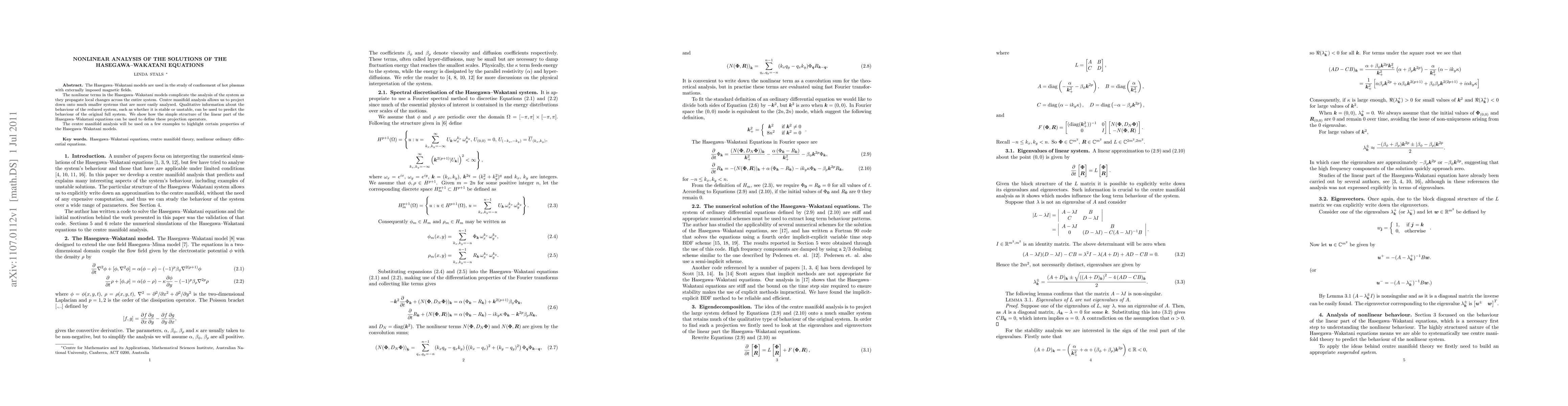 Researchers used centre manifold analysis to simplify the Hasegawa-Wakatani equations, a model for hot plasma confinement, and found that the linear part of the equations can be used to define projection operators.