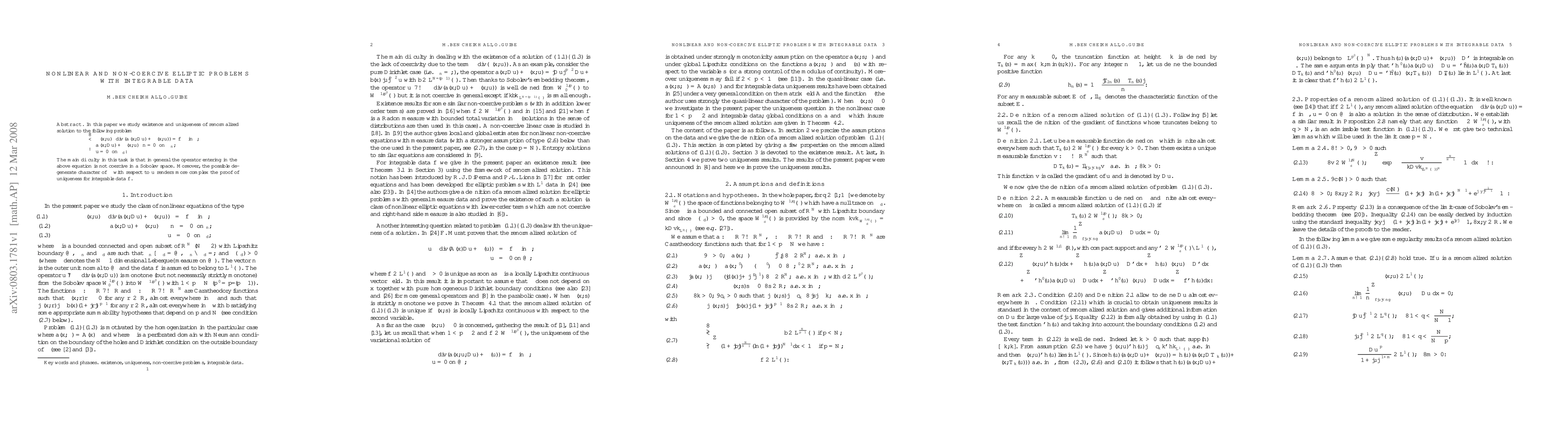 This paper studies the existence and uniqueness of renormalized solutions to nonlinear elliptic equations with non-coercive operators and integrable data, overcoming challenges in proving uniqueness due to potential degeneracy.
