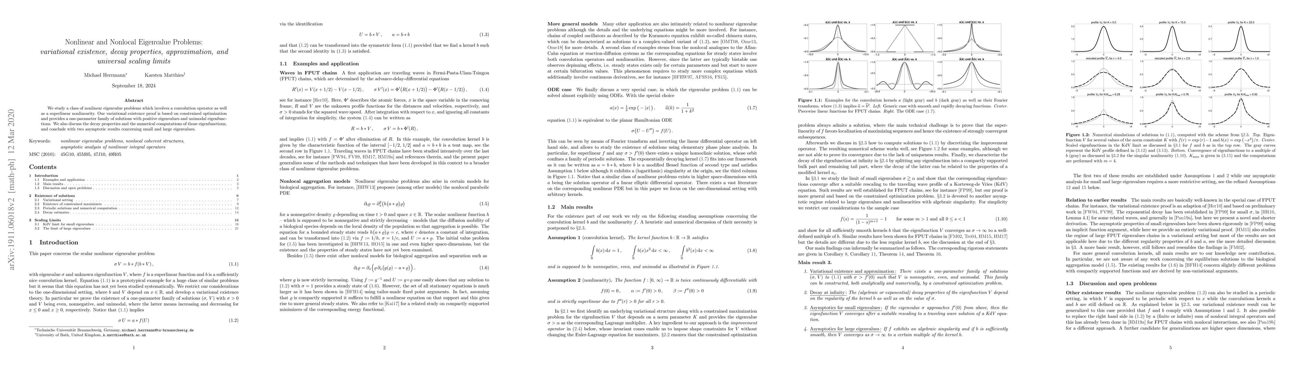We study a class of nonlinear eigenvalue problems which involves a convolution operator as well as a superlinear nonlinearity. Our variational existence proof is based on constrained optimization and provides a one-parameter family of solutions with positive eigenvalues and unimodal eigenfunctions. We also discuss the decay properties and the numerical computations of those eigenfunctions, and conclude with two asymptotic results concerning small and large eigenvalues.