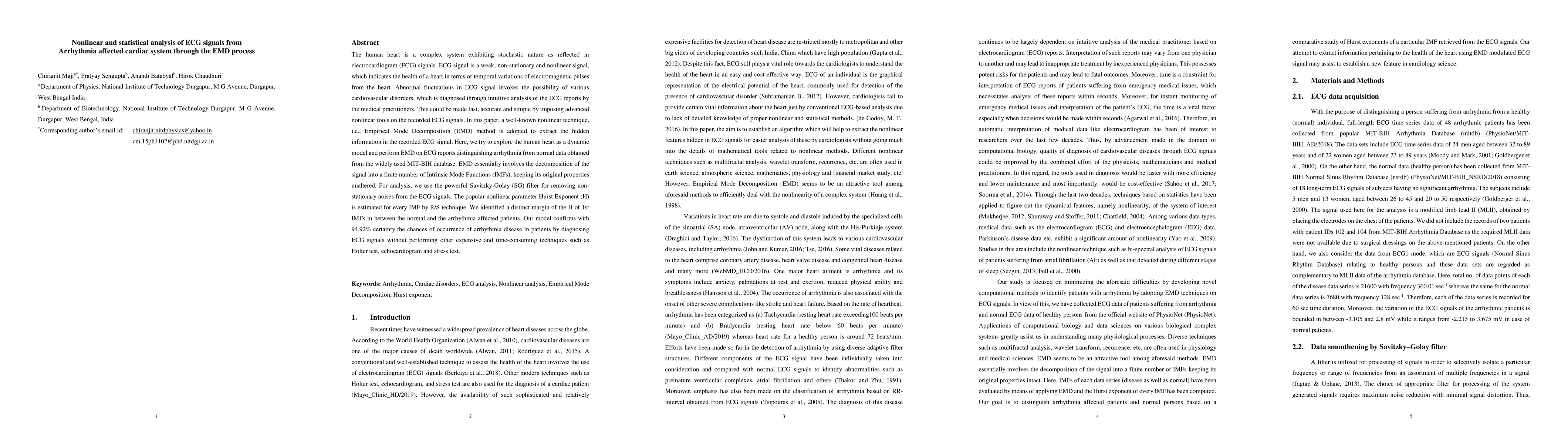 This paper employs the Empirical Mode Decomposition (EMD) method to analyze ECG signals for detecting arrhythmia. By decomposing the signals into Intrinsic Mode Functions (IMFs) and estimating the Hurst Exponent (H), the study distinguishes arrhythmia from normal ECG data with 94.92% accuracy, offering a cost-effective diagnostic alternative to traditional methods.