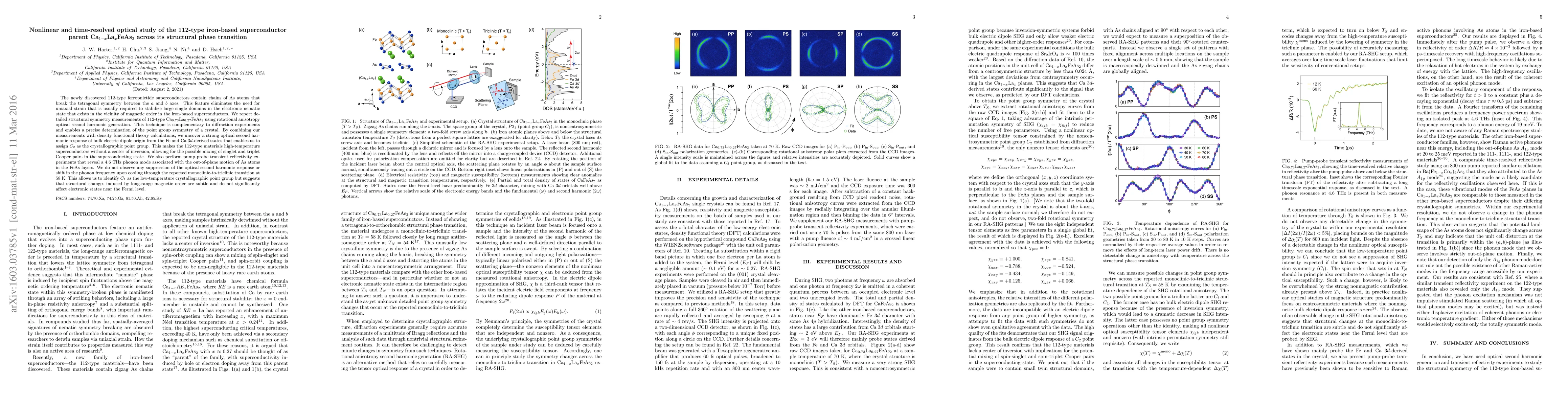 The newly discovered 112-type ferropnictide superconductors contain chains of As atoms that break the tetragonal symmetry between the $a$ and $b$ axes. This feature eliminates the need for uniaxial strain that is usually required to stabilize large single domains in the electronic nematic state that exists in the vicinity of magnetic order in the iron-based superconductors. We report detailed structural symmetry measurements of 112-type Ca$_{0.73}$La$_{0.27}$FeAs$_{2}$ using rotational anisotropy optical second harmonic generation. This technique is complementary to diffraction experiments and enables a precise determination of the point group symmetry of a crystal. By combining our measurements with density functional theory calculations, we uncover a strong optical second harmonic response of bulk electric dipole origin from the Fe and Ca $3d$-derived states that enables us to assign $C_2$ as the crystallographic point group. This makes the 112-type materials high-temperature superconductors without a center of inversion, allowing for the possible mixing of singlet and triplet Cooper pairs in the superconducting state. We also perform pump-probe transient reflectivity experiments that reveal a 4.6 THz phonon mode associated with the out-of-plane motion of As atoms in the FeAs layers. We do not observe any suppression of the optical second harmonic response or shift in the phonon frequency upon cooling through the reported monoclinic-to-triclinic transition at 58 K. This allows us to identify $C_1$ as the low-temperature crystallographic point group but suggests that structural changes induced by long-range magnetic order are subtle and do not significantly affect electronic states near the Fermi level.