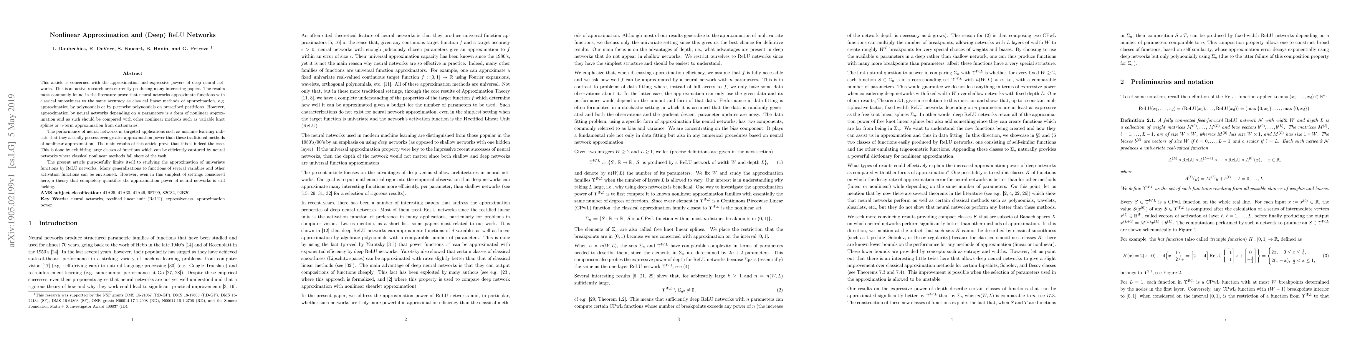 This article is concerned with the approximation and expressive powers of deep neural networks. This is an active research area currently producing many interesting papers. The results most commonly found in the literature prove that neural networks approximate functions with classical smoothness to the same accuracy as classical linear methods of approximation, e.g. approximation by polynomials or by piecewise polynomials on prescribed partitions. However, approximation by neural networks depending on n parameters is a form of nonlinear approximation and as such should be compared with other nonlinear methods such as variable knot splines or n-term approximation from dictionaries. The performance of neural networks in targeted applications such as machine learning indicate that they actually possess even greater approximation power than these traditional methods of nonlinear approximation. The main results of this article prove that this is indeed the case. This is done by exhibiting large classes of functions which can be efficiently captured by neural networks where classical nonlinear methods fall short of the task. The present article purposefully limits itself to studying the approximation of univariate functions by ReLU networks. Many generalizations to functions of several variables and other activation functions can be envisioned. However, even in this simplest of settings considered here, a theory that completely quantifies the approximation power of neural networks is still lacking.