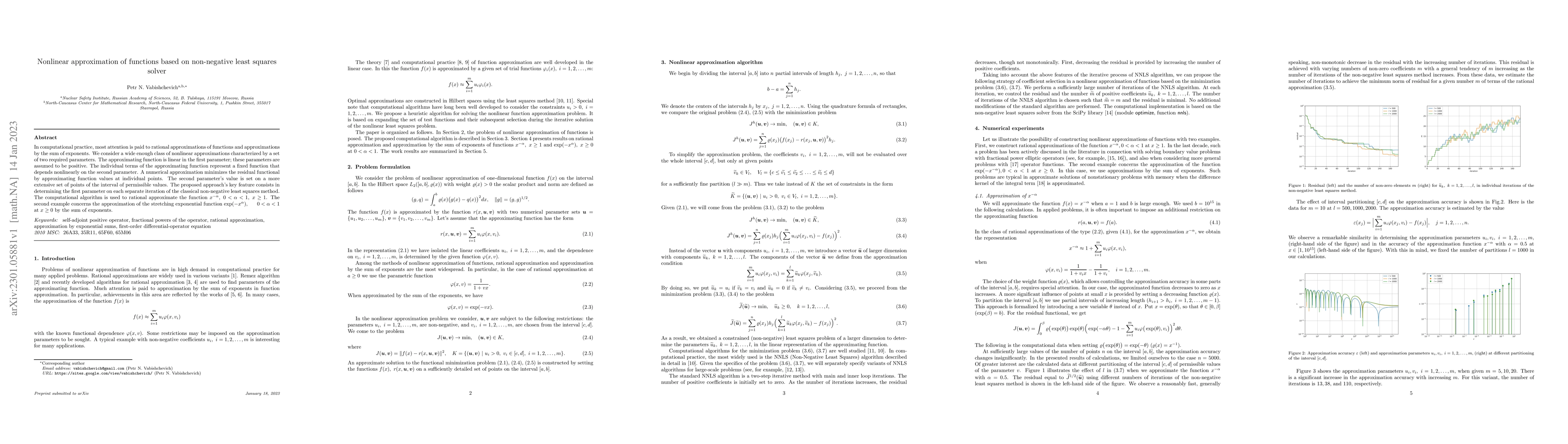 In computational practice, most attention is paid to rational approximations of functions and approximations by the sum of exponents. We consider a wide enough class of nonlinear approximations characterized by a set of two required parameters. The approximating function is linear in the first parameter; these parameters are assumed to be positive. The individual terms of the approximating function represent a fixed function that depends nonlinearly on the second parameter. A numerical approximation minimizes the residual functional by approximating function values at individual points. The second parameter's value is set on a more extensive set of points of the interval of permissible values. The proposed approach's key feature consists in determining the first parameter on each separate iteration of the classical non-negative least squares method. The computational algorithm is used to rational approximate the function $x^{-\alpha}, \ 0 < \alpha < 1, \ x \geq 1$. The second example concerns the approximation of the stretching exponential function $\exp(- x^{\alpha} ), \ \ \quad 0 < \alpha < 1$ at $ x \geq 0$ by the sum of exponents.