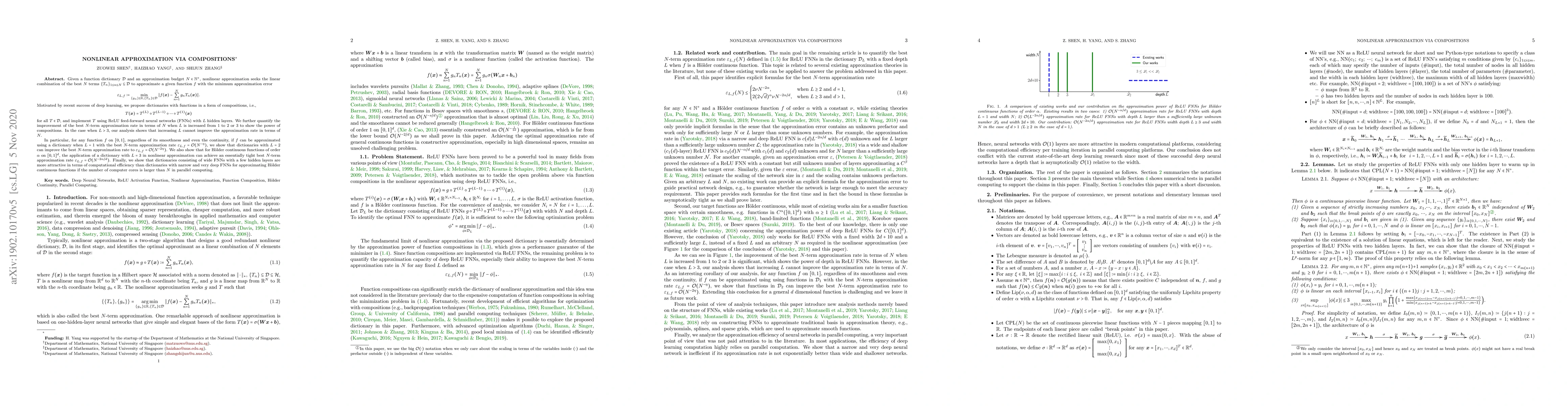 Given a function dictionary $\cal D$ and an approximation budget $N\in\mathbb{N}^+$, nonlinear approximation seeks the linear combination of the best $N$ terms $\{T_n\}_{1\le n\le N}\subseteq{\cal D}$ to approximate a given function $f$ with the minimum approximation error\[\varepsilon_{L,f}:=\min_{\{g_n\}\subseteq{\mathbb{R}},\{T_n\}\subseteq{\cal D}}\|f(x)-\sum_{n=1}^N g_n T_n(x)\|.\]Motivated by recent success of deep learning, we propose dictionaries with functions in a form of compositions, i.e.,\[T(x)=T^{(L)}\circ T^{(L-1)}\circ\cdots\circ T^{(1)}(x)\]for all $T\in\cal D$, and implement $T$ using ReLU feed-forward neural networks (FNNs) with $L$ hidden layers. We further quantify the improvement of the best $N$-term approximation rate in terms of $N$ when $L$ is increased from $1$ to $2$ or $3$ to show the power of compositions. In the case when $L>3$, our analysis shows that increasing $L$ cannot improve the approximation rate in terms of $N$. In particular, for any function $f$ on $[0,1]$, regardless of its smoothness and even the continuity, if $f$ can be approximated using a dictionary when $L=1$ with the best $N$-term approximation rate $\varepsilon_{L,f}={\cal O}(N^{-\eta})$, we show that dictionaries with $L=2$ can improve the best $N$-term approximation rate to $\varepsilon_{L,f}={\cal O}(N^{-2\eta})$. We also show that for H\"older continuous functions of order $\alpha$ on $[0,1]^d$, the application of a dictionary with $L=3$ in nonlinear approximation can achieve an essentially tight best $N$-term approximation rate $\varepsilon_{L,f}={\cal O}(N^{-2\alpha/d})$. Finally, we show that dictionaries consisting of wide FNNs with a few hidden layers are more attractive in terms of computational efficiency than dictionaries with narrow and very deep FNNs for approximating H\"older continuous functions if the number of computer cores is larger than $N$ in parallel computing.