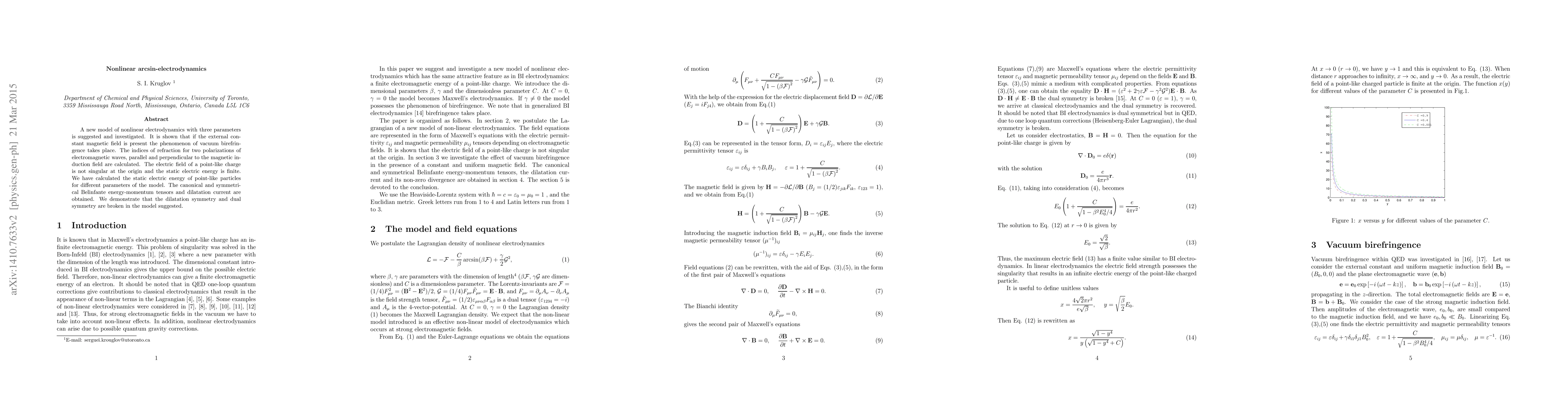 A new model of nonlinear electrodynamics with three parameters is suggested and investigated. It is shown that if the external constant magnetic field presents the phenomenon of vacuum birefringence takes place. The indexes of refraction for two polarizations of electromagnetic waves, parallel and perpendicular to the magnetic induction field are calculated. The electric field of a point-like charge is not singular at the origin and the static electric energy is finite. We have calculated the static electric energy of point-like particles for different parameters of the model. The canonical and symmetrical Belinfante energy-momentum tensors and dilatation current are obtained. We demonstrate that the dilatation symmetry and dual symmetry are broken in the model suggested.