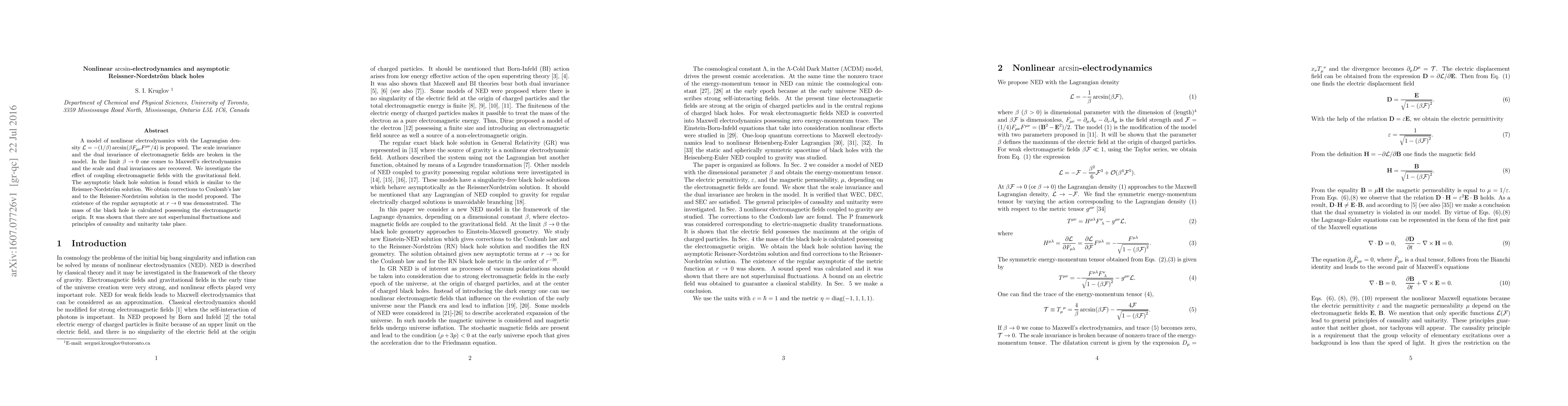 This paper proposes a nonlinear $\arcsin$-electrodynamics model and investigates its gravitational implications, finding an asymptotic black hole solution similar to Reissner-Nordström's. It demonstrates corrections to Coulomb's law and maintains causality and unitarity without superluminal fluctuations.