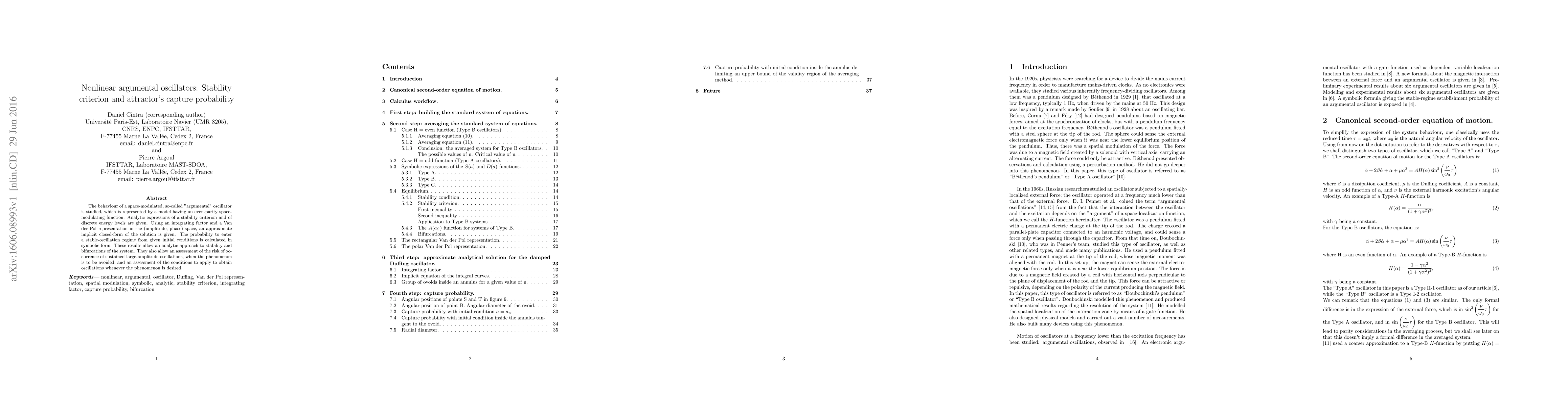 The behaviour of a space-modulated, so-called "argumental" oscillator is studied, which is represented by a model having an even-parity space-modulating function. Analytic expressions of a stability criterion and of discrete energy levels are given. Using an integrating factor and a Van der Pol representation in the (amplitude, phase) space, an approximate implicit closed-form of the solution is given. The probability to enter a stable-oscillation regime from given initial conditions is calculated in symbolic form. These results allow an analytic approach to stability and bifurcations of the system. They also allow an assessment of the risk of occurrence of sustained large-amplitude oscillations, when the phenomenon is to be avoided, and an assessment of the conditions to apply to obtain oscillations whenever the phenomenon is desired.