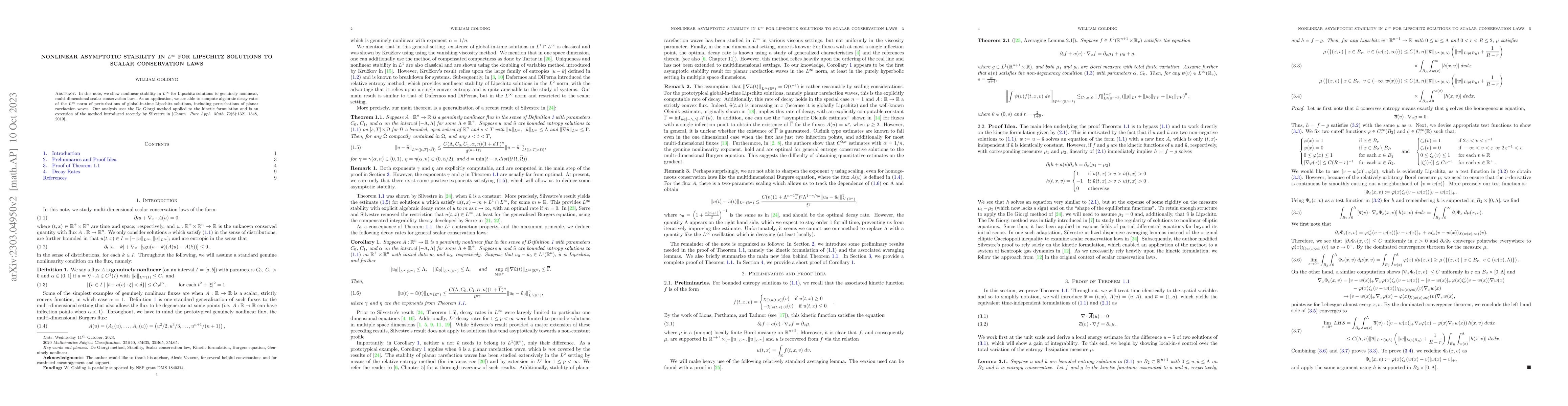 This paper demonstrates nonlinear stability in $L^\infty$ for Lipschitz solutions to multi-dimensional scalar conservation laws, employing the De Giorgi method on the kinetic formulation. It also provides explicit algebraic decay rates for perturbations, extending Silvestre’s recent method.