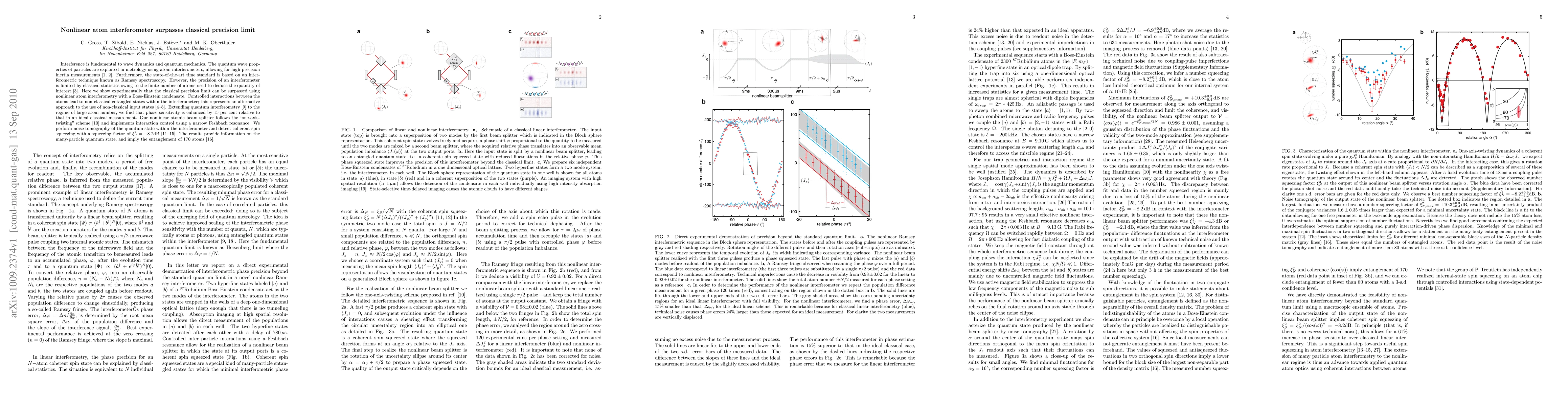 This paper demonstrates that nonlinear atom interferometry with a Bose-Einstein condensate can surpass classical precision limits by exploiting entangled states formed through controlled atomic interactions. The experiment shows a 15% enhancement in phase sensitivity and reveals coherent spin squeezing, indicating the entanglement of 170 atoms.